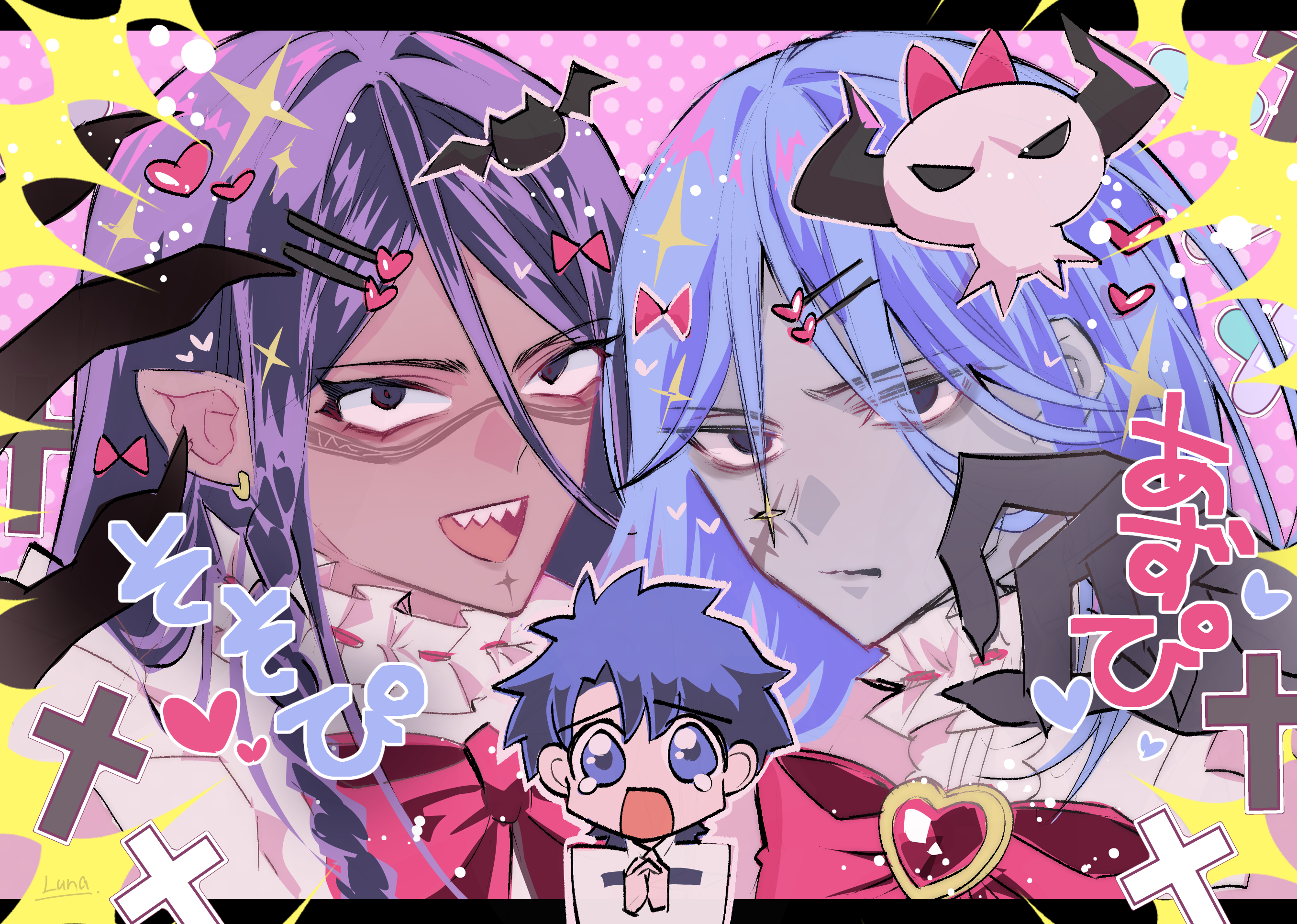 3boys azrael_(grand_assassin)_(fate) bags_under_eyes black_eyes blue_hair bow camazotz_(fate) colored_skin dark-skinned_male dark_skin deformed facial_scar facial_tattoo fate/grand_order fate_(series) fujimaru_ritsuka_(male) grey_skin hair_between_eyes hair_bow hair_ornament hairclip heart highres long_hair lunarose male_focus multiple_boys open_mouth own_hands_together pointy_ears purikura purple_hair scar scar_on_cheek scar_on_face short_hair skull_hair_ornament smile tattoo tearing_up