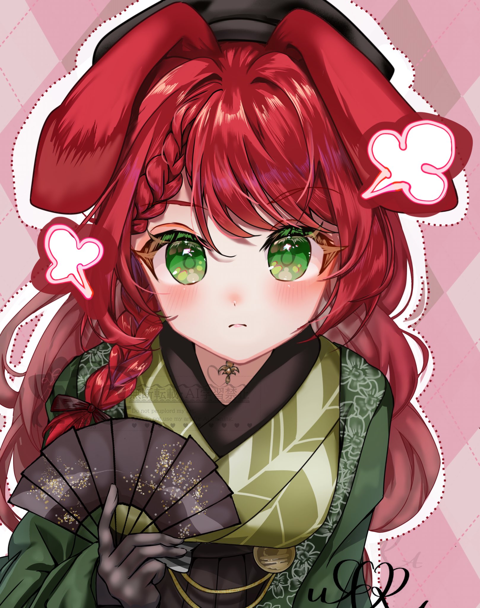 1girl animal_ears black_gloves blush braid closed_mouth commentary_request gloves green_eyes green_kimono hand_fan highres holding holding_fan indie_virtual_youtuber japanese_clothes kimono long_hair long_sleeves looking_at_viewer minashiro_aroe pink_background red_hair rina_xx203 solo straight-on swept_bangs upper_body virtual_youtuber