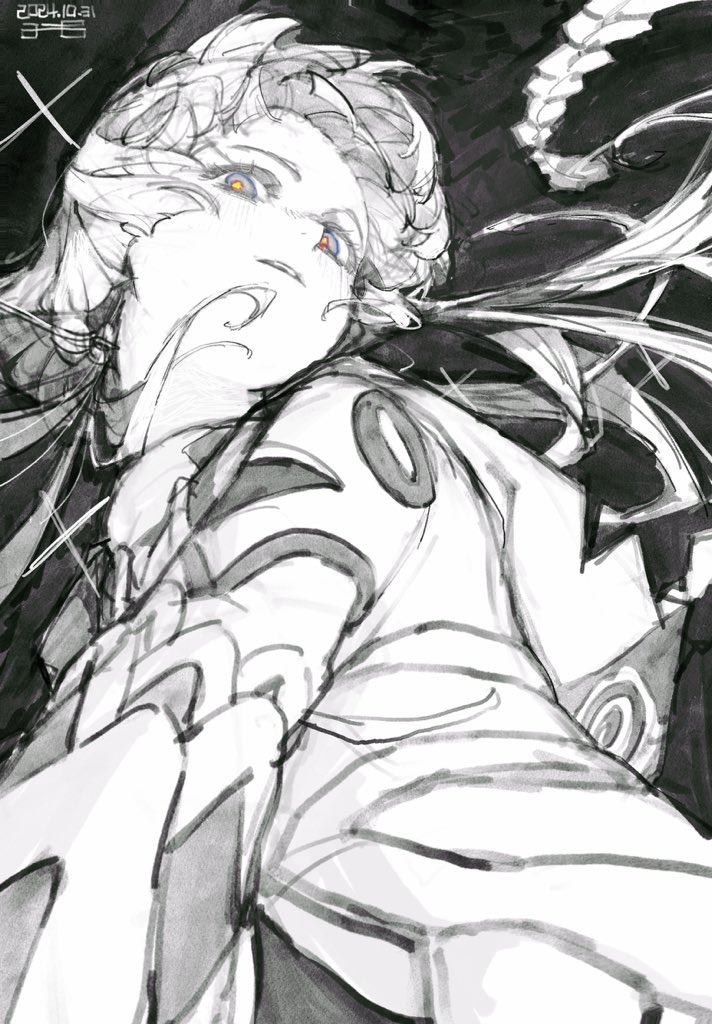 1girl black_background blue_eyes braid coat dated from_below greyscale kaf_(kamitsubaki_studio) kamitsubaki_studio long_hair looking_at_viewer monochrome multicolored_eyes ofgwr parted_lips partially_colored red_eyes solo two-tone_eyes upper_body virtual_youtuber yellow_pupils