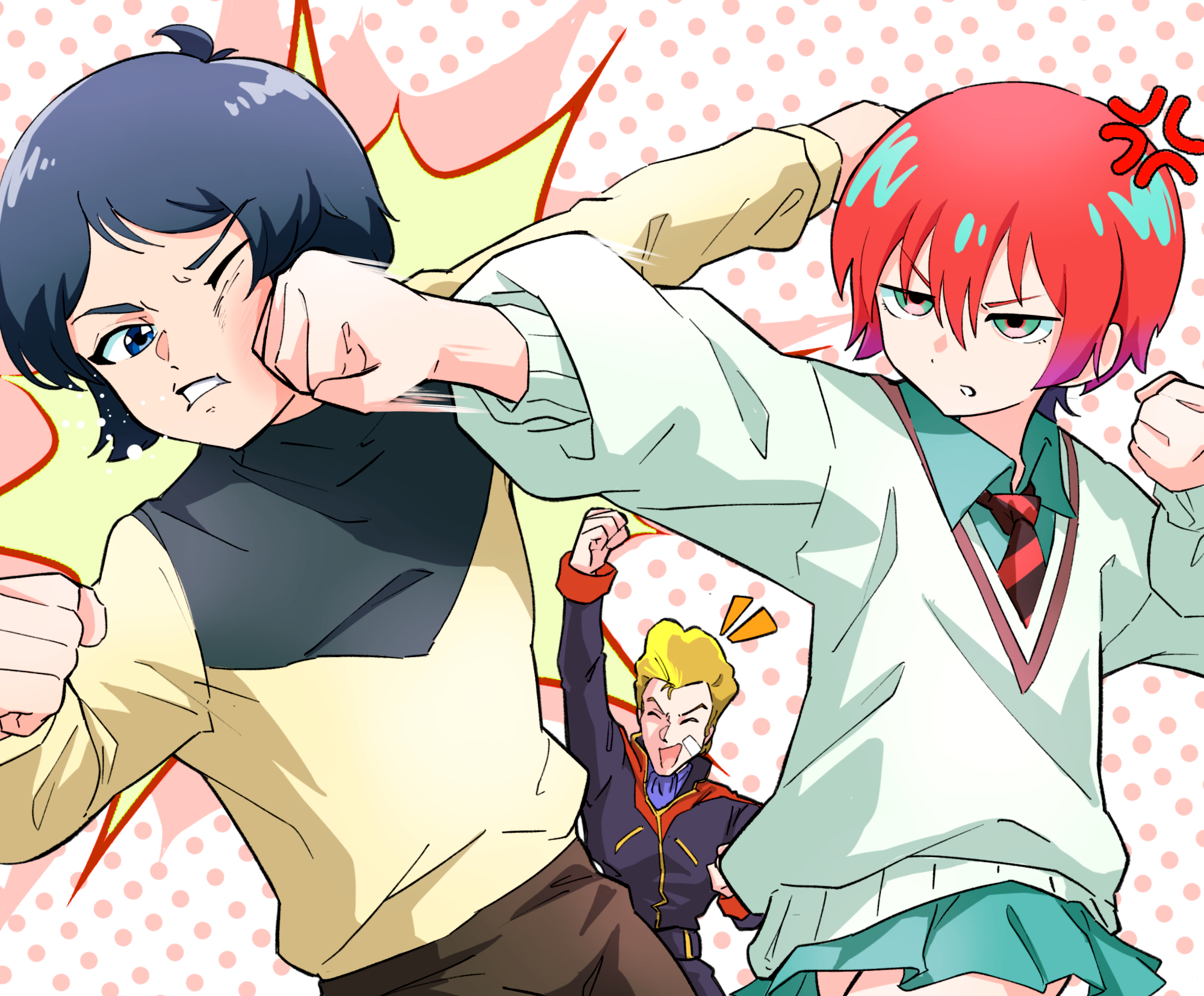 1girl 2boys alternate_universe amate_yuzuriha anger_vein arm_up bandaid battle black_hair blonde_hair blue_eyes blue_scarf commentary_request crossover duel green_eyes gundam gundam_gquuuuuux guppi_(artist) highres in-franchise_crossover injury jerid_messa kamille_bidan martial_arts multiple_boys necktie parody polka_dot polka_dot_background pompadour punching red_hair scarf school_uniform skirt sweater titans_(gundam) zeta_gundam