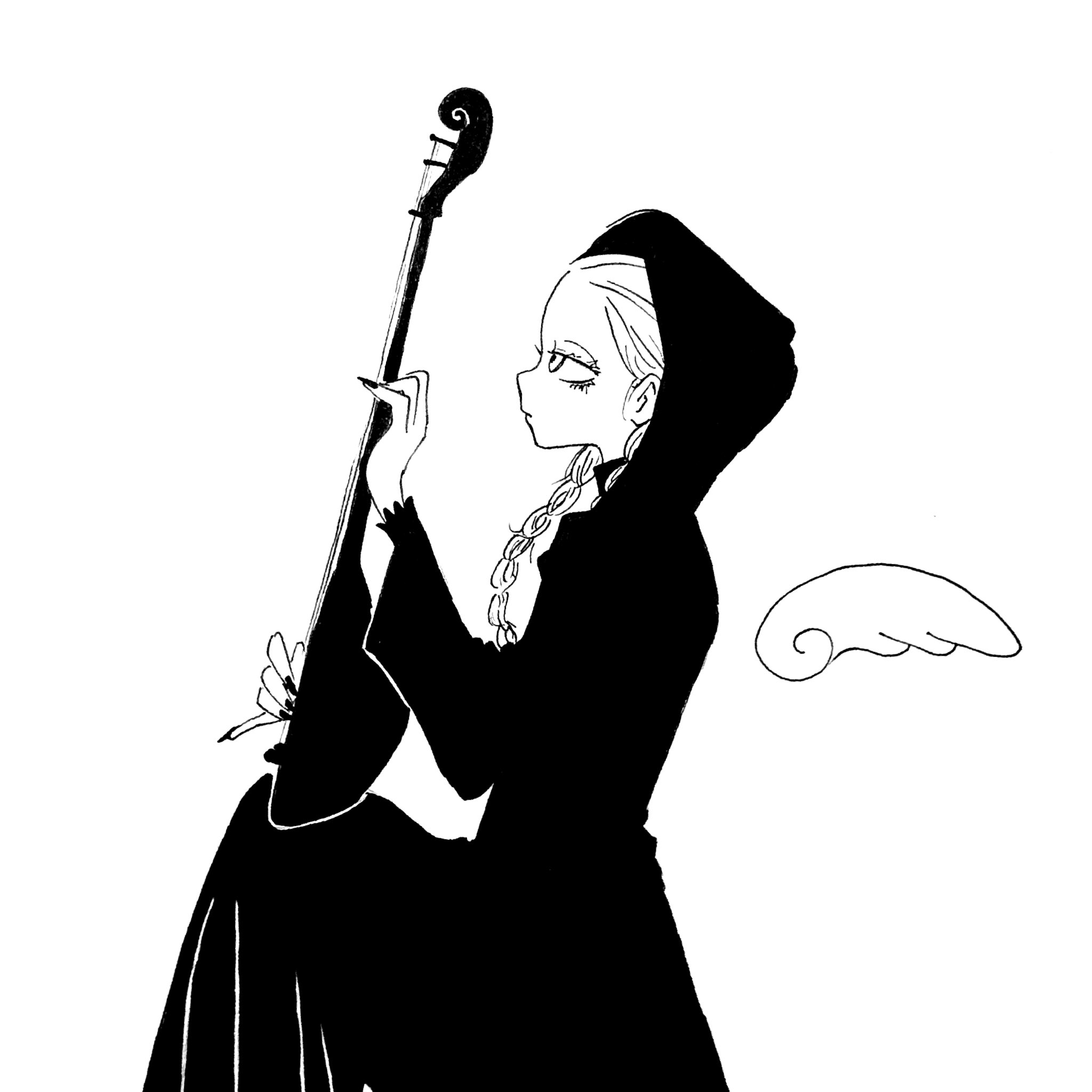 1girl balalaika_(instrument) braid detached_wings dress expressionless fingernails highres hood instrument long_fingernails long_hair monochrome music original playing_instrument profile shi_(yotsuhaka) solo twin_braids wings