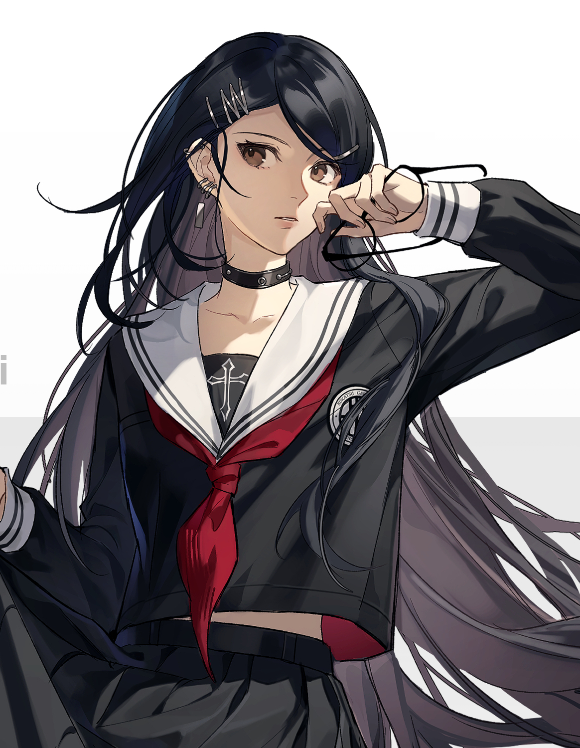 1girl alternate_costume alternate_hair_length alternate_hairstyle black-framed_eyewear black_choker black_hair black_serafuku black_shirt black_skirt brown_eyes choker clothes_lift commentary cropped cross earrings floating_hair glasses hair_ornament hairclip highres holding holding_removed_eyewear iroin11 jewelry katayama_kumi long_hair long_sleeves looking_to_the_side necktie parted_lips persona persona_5 persona_5:_the_phantom_x red_necktie sailor_collar school_uniform serafuku shirt skirt skirt_lift solo unworn_eyewear upper_body very_long_hair white_sailor_collar