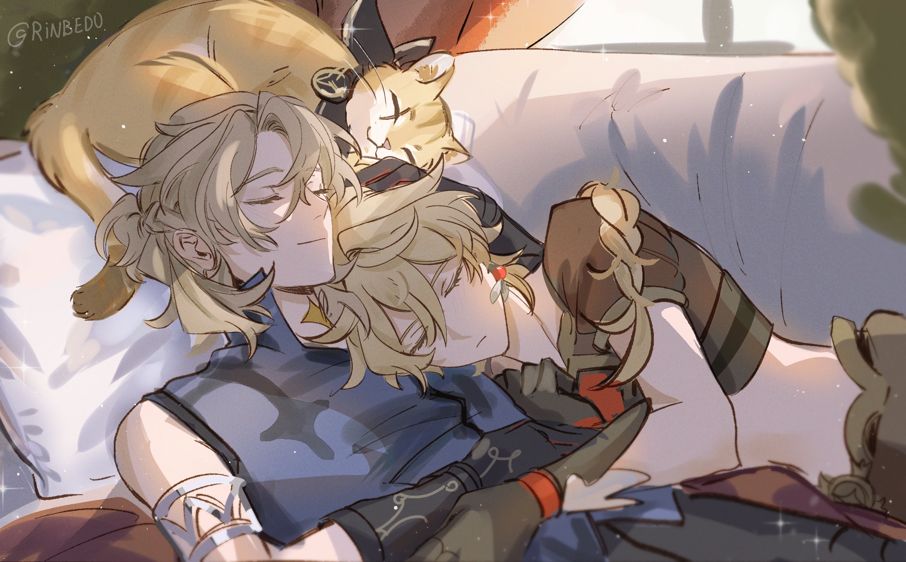 2boys aether_(genshin_impact) albedo_(genshin_impact) animal animal_ears animal_nose armlet artist_name bandana bare_shoulders black_bandana black_gloves blanket blonde_hair blue_pants blue_shirt braid brown_pants brown_shirt cat cat_ears cat_tail closed_eyes closed_mouth commentary curtains day earrings english_commentary genshin_impact gloves hair_between_eyes hand_on_another's_head highres jewelry long_hair low-braided_long_hair low-tied_long_hair lying male_focus mandarin_collar midriff multiple_boys on_back on_bed on_side pants pet pillow rinjkk scar shadow shirt short_hair short_sleeves single_braid single_earring sir_pouncelot_(genshin_impact) sleeveless sleeveless_shirt smile sparkle spiked_armlet tail window yaoi yellow_fur