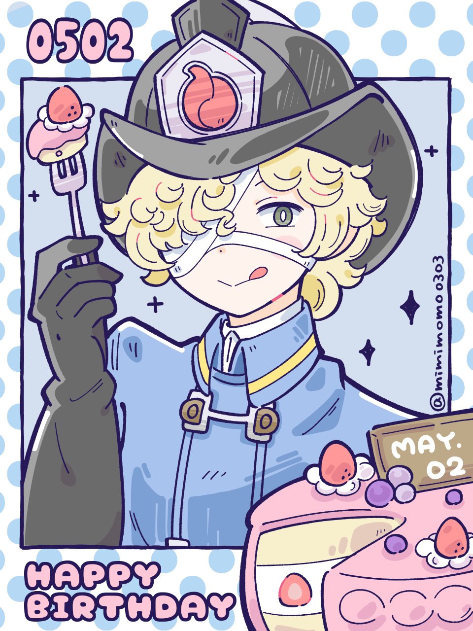 1boy :q bandage_over_one_eye black_gloves blonde_hair blue_jacket bright_pupils cake curly_hair dated firefighter_helmet florian_brand food fork gloves green_eyes happy_birthday highres holding holding_fork identity_v jacket looking_to_the_side male_focus mimimomo0303 tongue tongue_out white_pupils
