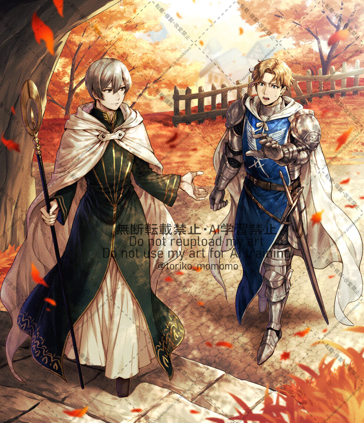2boys armor autumn_leaves blonde_hair cape commentary_request crick_(octopath_traveler) falling_leaves gauntlets greaves grey_hair highres holding holding_staff knight leaf male_focus multiple_boys octopath_traveler octopath_traveler_ii outdoors sheath sheathed staff stairs sword temenos_mistral toriko_momomo walking watermark watermark_grid weapon white_cape
