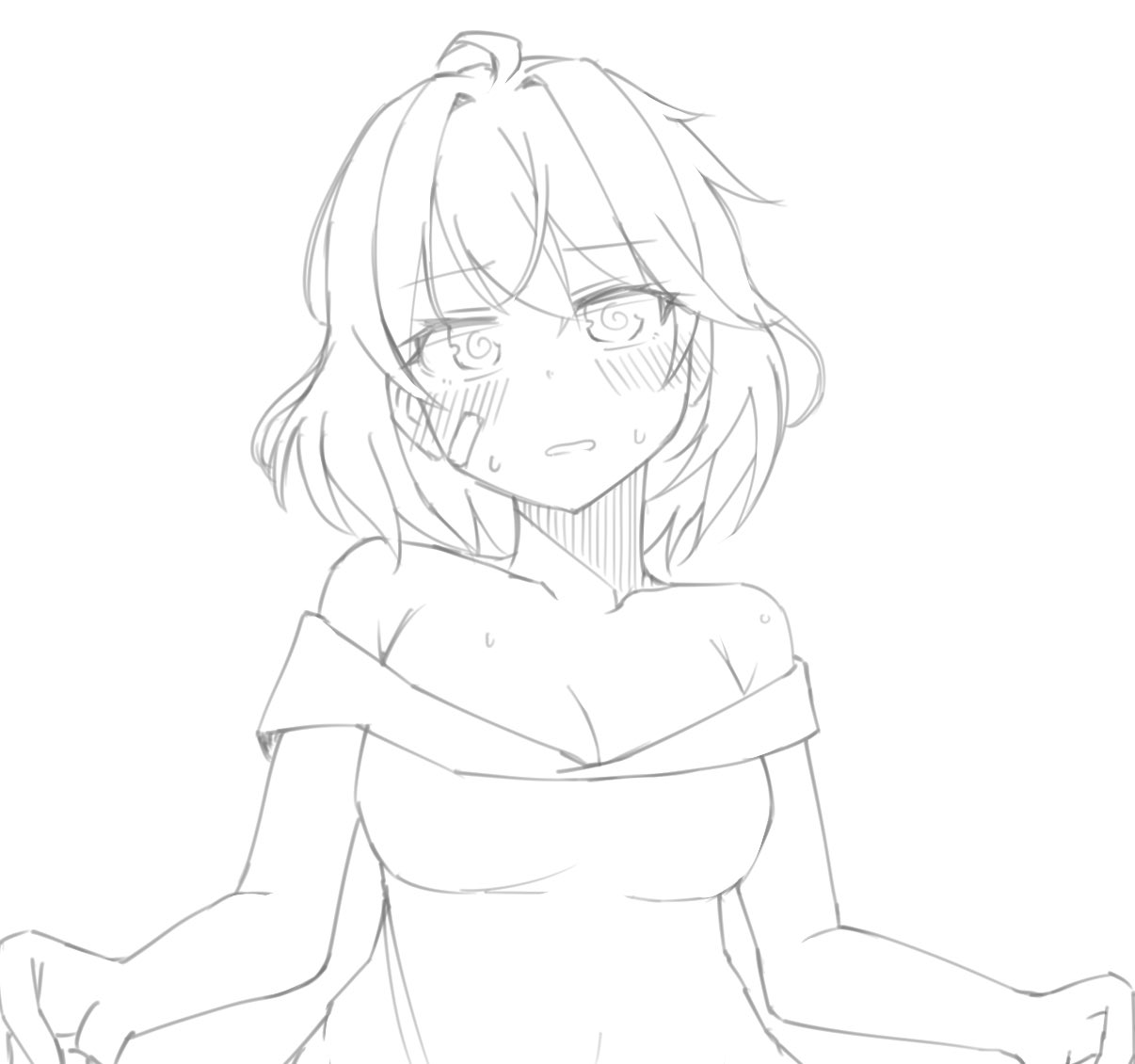 1girl ahoge bandaid bandaid_on_face breasts cleavage collarbone dress holding_own_dress lineart looking_at_viewer medium_breasts oboro_(11th_anniversary)_(kancolle) oboro_(kancolle) off-shoulder_dress off_shoulder short_hair simple_background solo tatahai upper_body