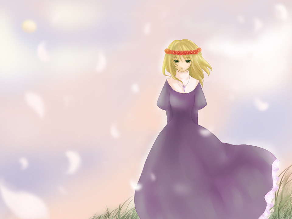 1girl blonde_hair blue_sky closed_mouth cloud cloudy_sky commentary_request cross cross_necklace dress feet_out_of_frame flower full_moon grass green_eyes head_wreath jewelry juliet_sleeves long_sleeves looking_at_viewer moon necklace outdoors petals priest_(ragnarok_online) puffy_sleeves purple_dress ragnarok_online red_flower short_hair sky smile solo standing wind yu_(yutuku)