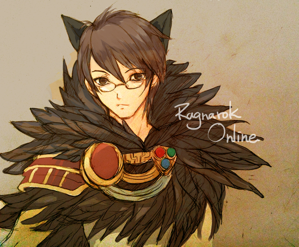 1boy animal_ears brown_background brown_eyes brown_hair cat_boy cat_ears chinese_commentary closed_mouth commentary_request copyright_name expressionless fur_collar glasses looking_at_viewer male_focus mitsukisumi ragnarok_online short_hair solo sorcerer_(ragnarok_online) upper_body
