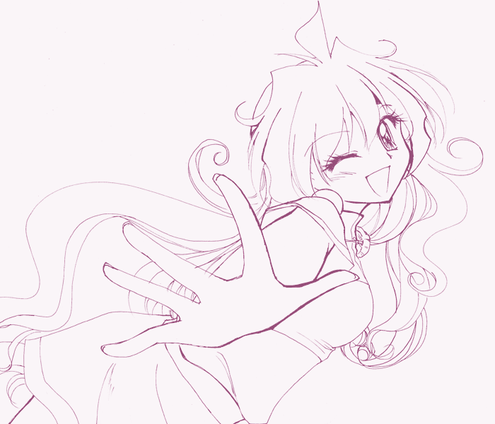 1girl breasts commentary_request cowboy_shot dress lina_inverse lineart long_hair looking_at_viewer medium_breasts monochrome one_eye_closed open_mouth purple_theme short_sleeves simple_background sketch slayers smile solo yuzu_(myrica)