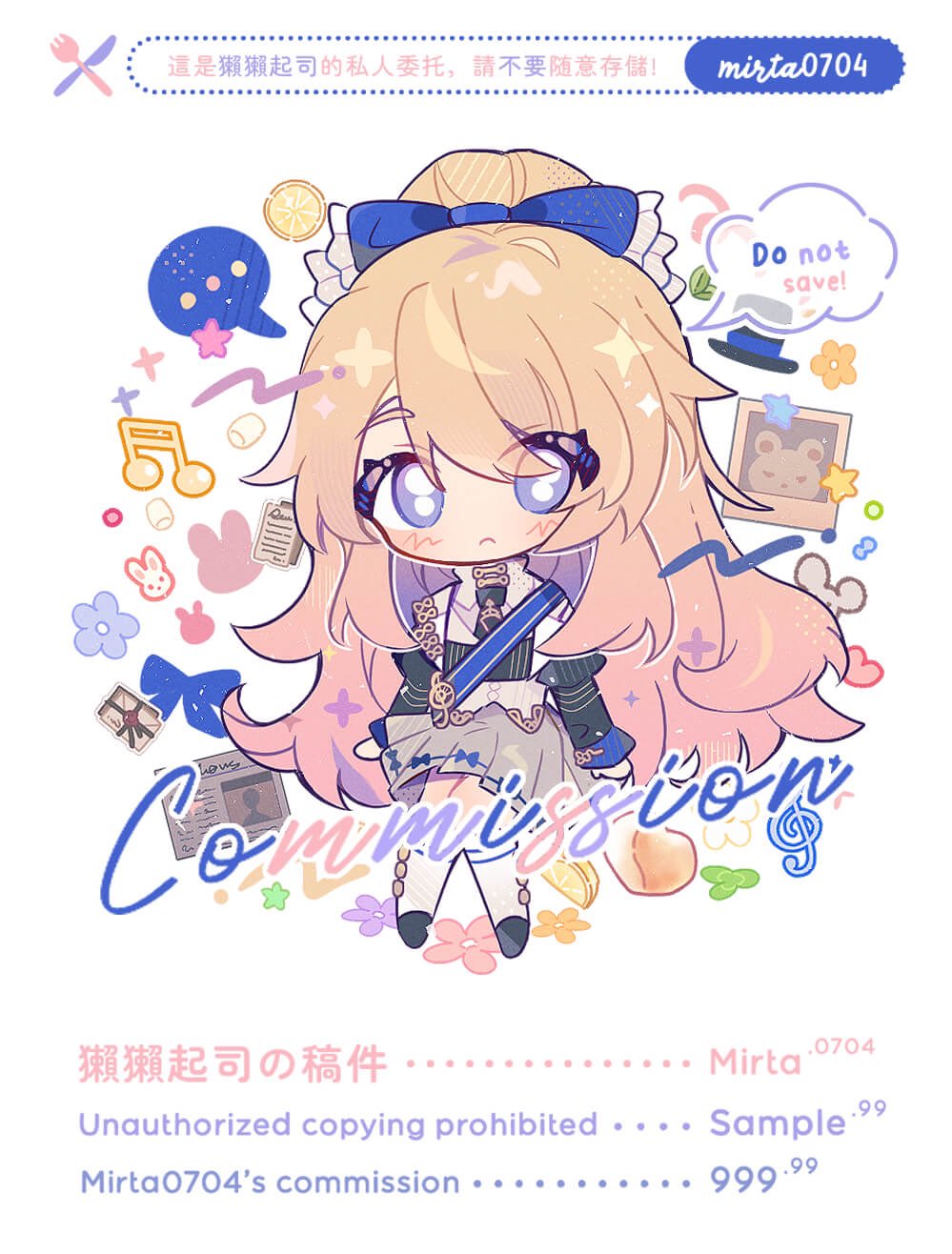 1girl artist_name black_necktie black_shirt black_shoes blonde_hair blue_bow blue_eyes blush_stickers bow chibi chibi_only closed_mouth commentary commission full_body grey_skirt hair_between_eyes hair_bow hashtag-only_commentary highres long_hair long_sleeves looking_at_viewer mirta necktie original pleated_skirt shirt shoes simple_background skirt socks solo twitter_username very_long_hair watermark white_background white_socks
