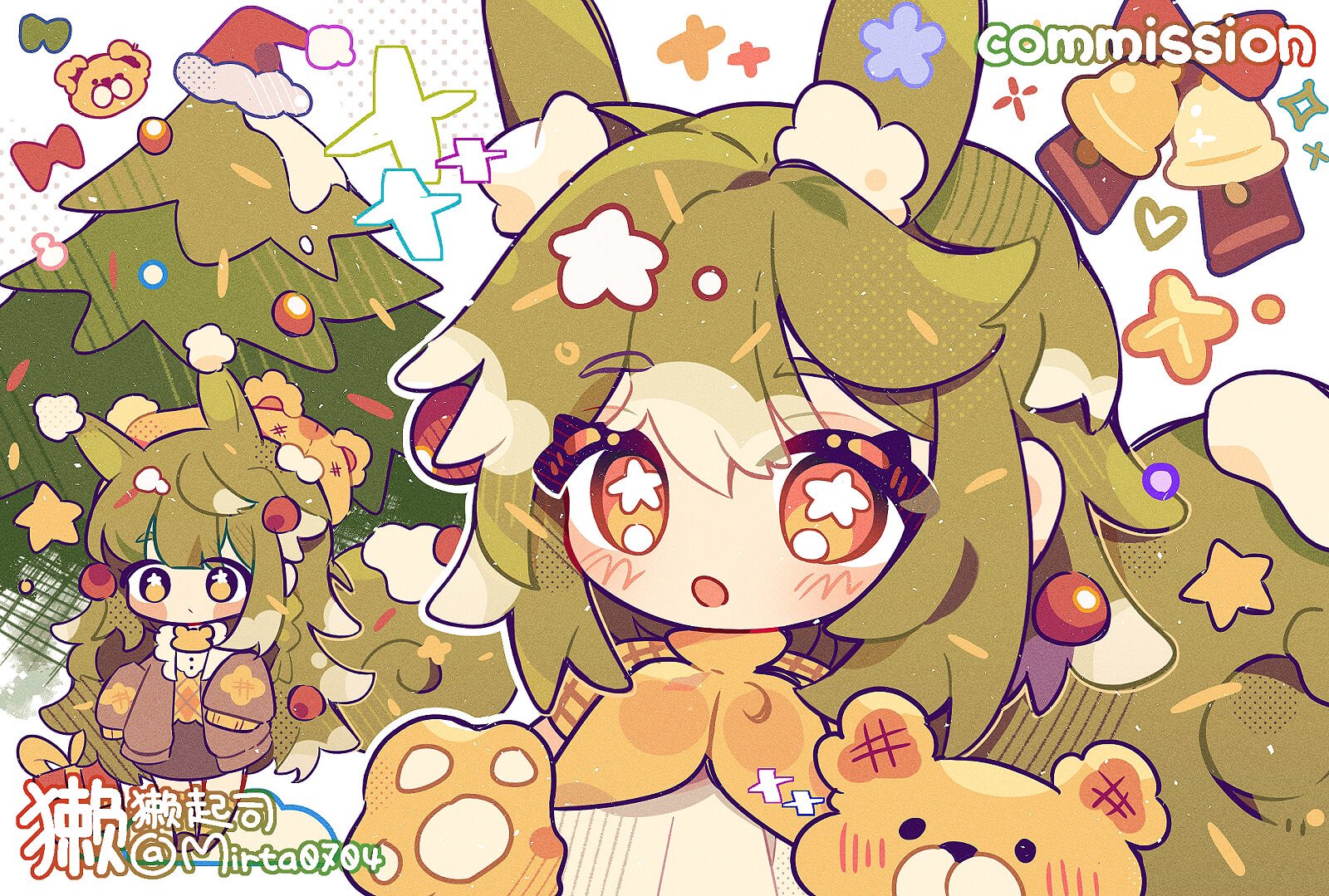 1girl :o animal_ears bell blush_stickers brown_coat chibi christmas_tree closed_mouth coat commentary commission green_hair hair_between_eyes highres long_hair long_sleeves looking_at_viewer mirta multiple_views neckerchief open_clothes open_coat open_mouth orange_eyes original rabbit_ears rabbit_girl simple_background star-shaped_pupils star_(symbol) untranslatable_commentary symbol-shaped_pupils twitter_username upper_body white_background yellow_neckerchief