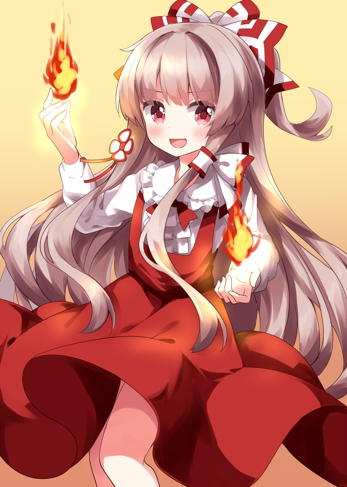 1girl :d alternate_costume blush bow brown_hair commentary_request cowboy_shot dress fire floating_hair frilled_shirt_collar frills fujiwara_no_mokou hair_bow hair_ornament hair_tubes hands_up highres long_hair long_sleeves looking_at_viewer magic open_mouth pinafore_dress pyrokinesis red_bow red_dress red_eyes ruu_(tksymkw) shirt sidelocks single_hair_tube sleeveless sleeveless_dress smile solo standing touhou white_bow white_shirt yellow_background