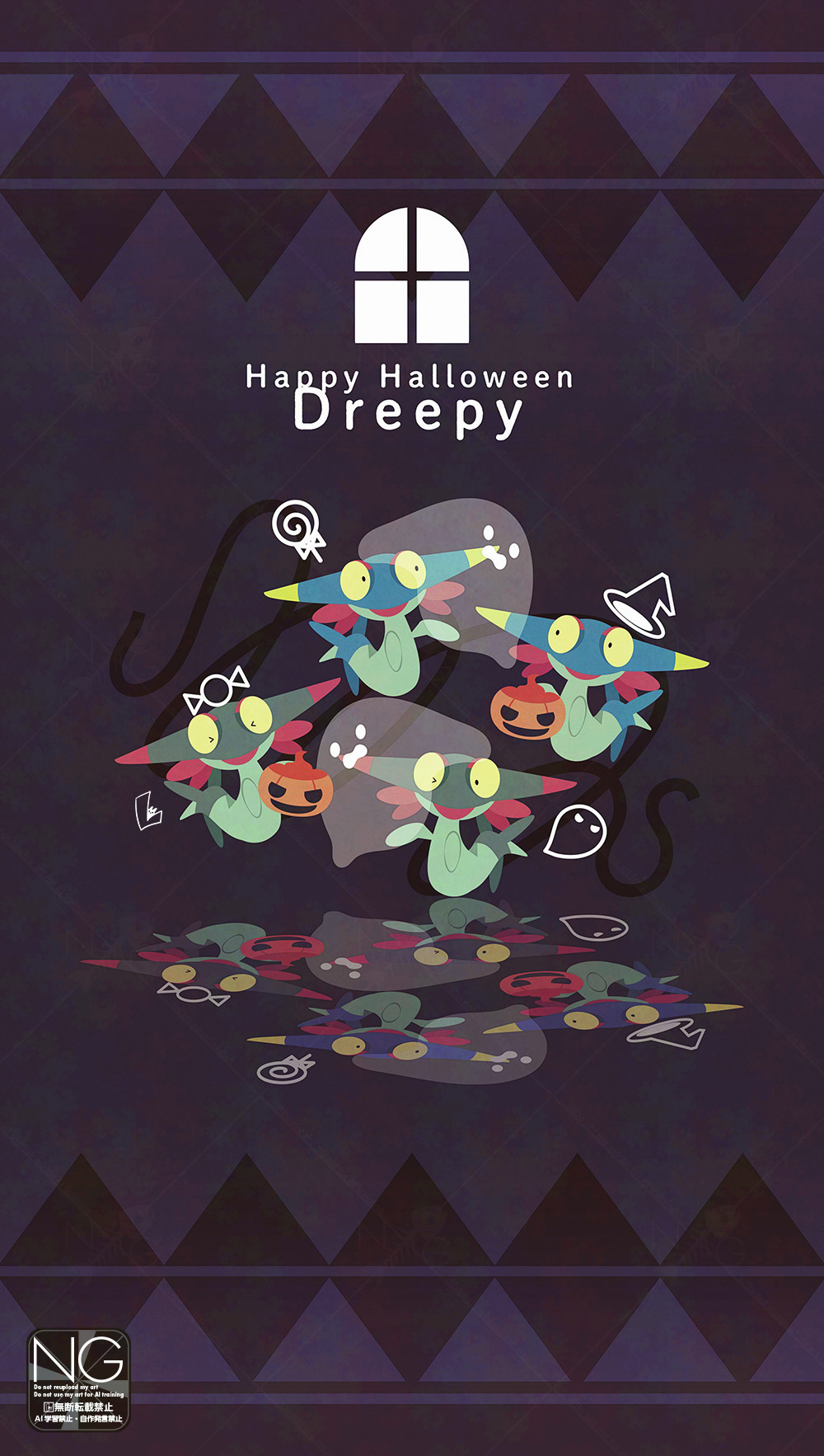 >_< alternate_color candy colored_sclera dreepy food gen_8_pokemon ghost halloween_bucket hat highres lollipop meme_(sleepsheep) nintendo no_humans one_eye_closed open_mouth pokemon pokemon_(creature) pokemon_focus reflection shiny_pokemon smile swirl_lollipop witch_hat yellow_eyes