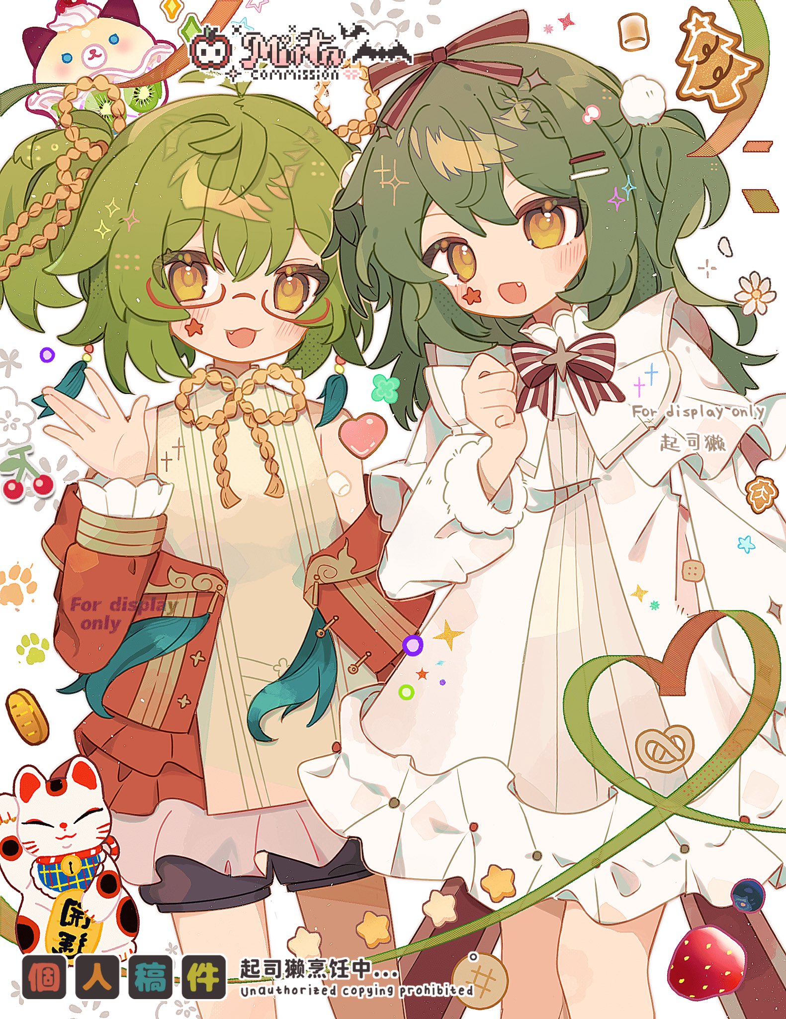2girls :3 :d :o black_shorts blush bow bowtie coin commentary commission dress fang feet_out_of_frame glasses gold green_hair hair_ornament hair_ribbon hand_up highres jacket koban_(gold) long_hair long_sleeves looking_at_viewer maneki-neko mirta multiple_girls neck_ribbon open_clothes open_jacket open_mouth original pom_pom_(clothes) pom_pom_hair_ornament red-framed_eyewear red_bow red_bowtie red_jacket red_ribbon ribbon semi-rimless_eyewear short_hair shorts simple_background smile standing striped_bow striped_bowtie striped_clothes untranslatable_commentary two_side_up under-rim_eyewear watermark white_background white_dress yellow_eyes yellow_ribbon