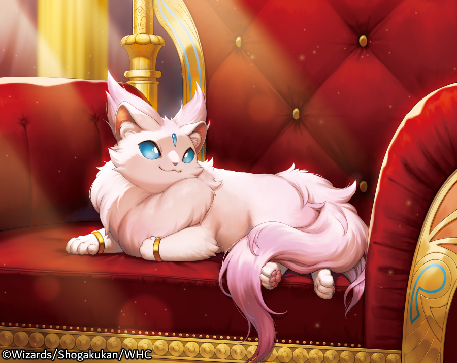:3 animal bangle blue_eyes bracelet cat chair closed_mouth copyright_name duel_masters jewelry kemonomichi_(blue_black) no_humans nyahan_(duel_masters) official_art on_chair pawpads solo throne white_cat