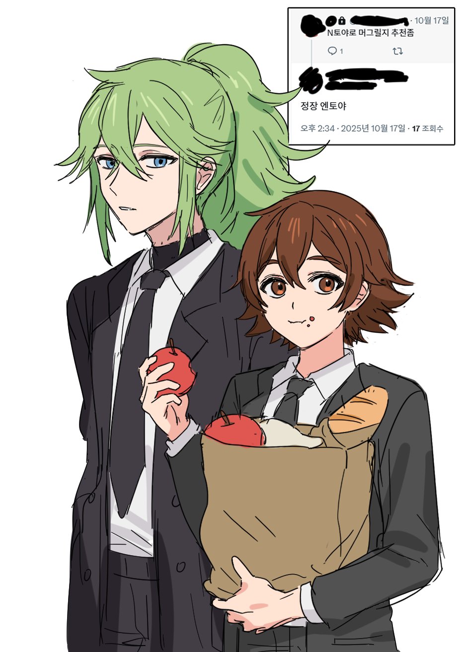 2boys alternate_costume apple bag black_jacket black_necktie black_pants bread brown_eyes brown_hair closed_mouth collared_shirt commentary_request food food_on_face fruit hair_between_eyes hand_up highres hilbert_(pokemon) holding holding_food holding_fruit jacket korean_commentary korean_text long_sleeves looking_at_viewer male_focus multiple_boys n_(pokemon) necktie nintendo open_clothes open_jacket p_(flavorppp) pants paper_bag pokemon pokemon_black_and_white shirt short_hair translation_request white_background white_shirt