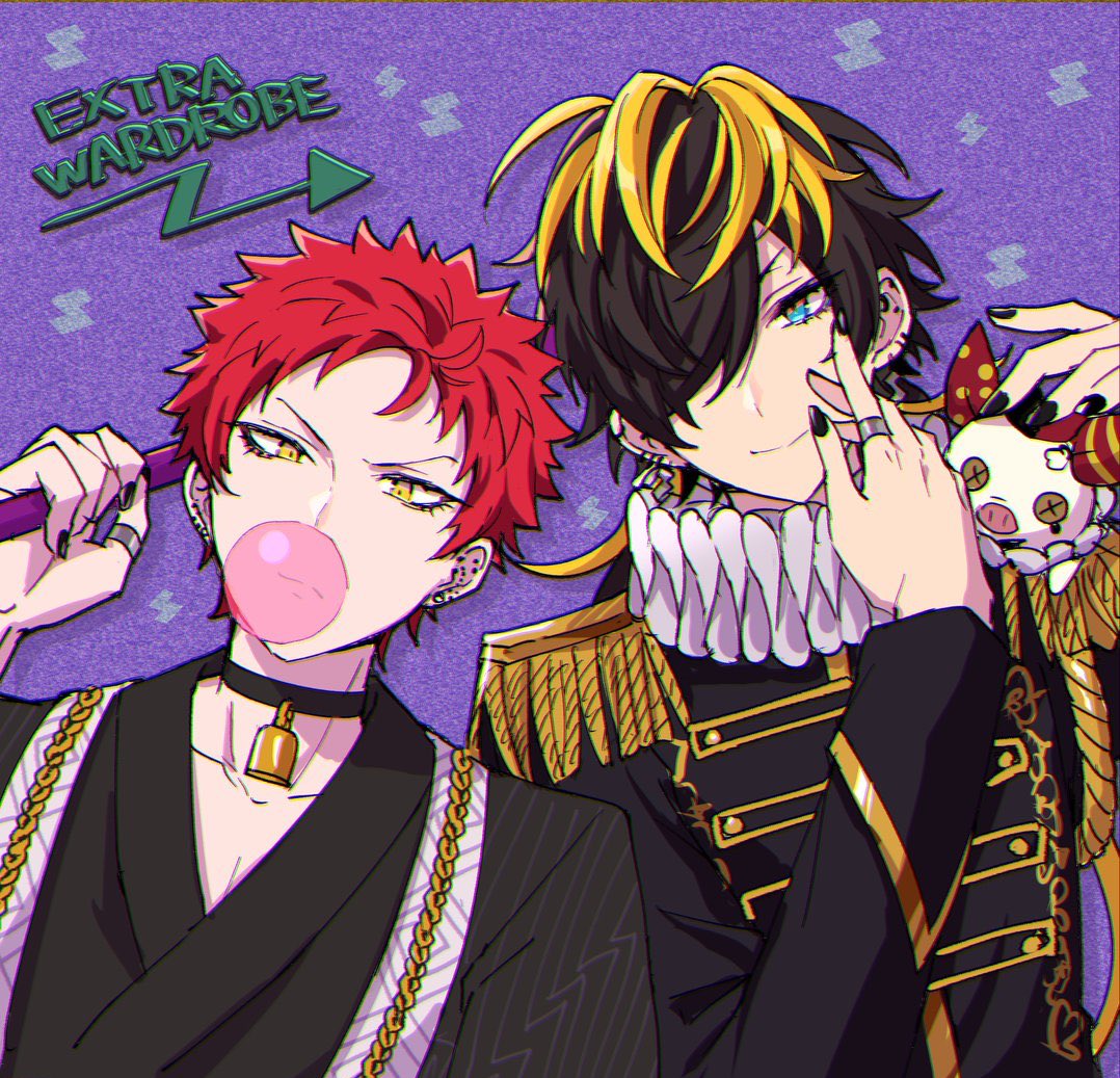 2boys aimono_jyushi bell black_choker black_hair black_jacket black_nails blonde_streaks blowing_bubble_gum blue_eyes chewing_gum choker ear_piercing earrings english_text epaulettes fujisaki_(ofuton_division) furrowed_brow gold_trim hair_over_one_eye harai_kuko head_tilt hypnosis_mic jacket jewelry looking_at_viewer male_focus multicolored_hair multiple_boys neck_bell neck_ruff piercing red_hair ring smile upper_body yellow_eyes