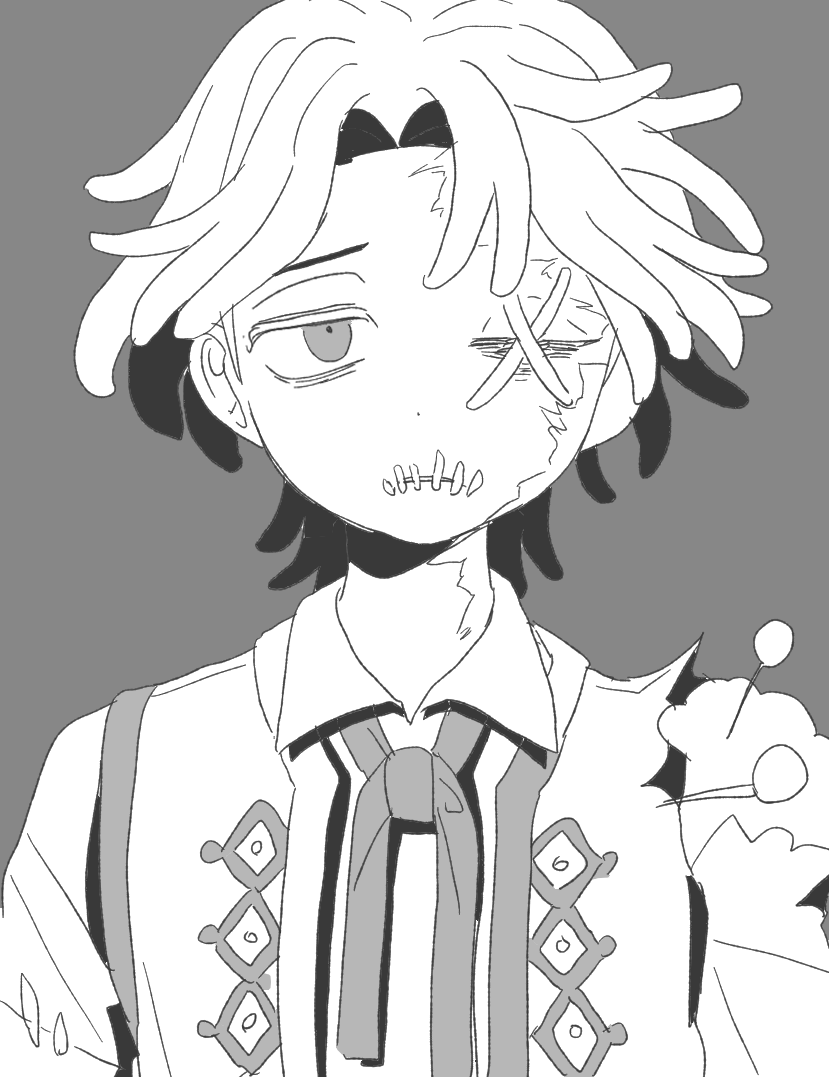 1boy ascot cross_stitch downturned_eyes frown grey_ascot grey_theme h_cha_r hair_intakes identity_v looking_at_viewer male_focus matthias_czernin monochrome pin portrait scar scar_on_face stitched_eye stitched_mouth stitches straight-on stuffing