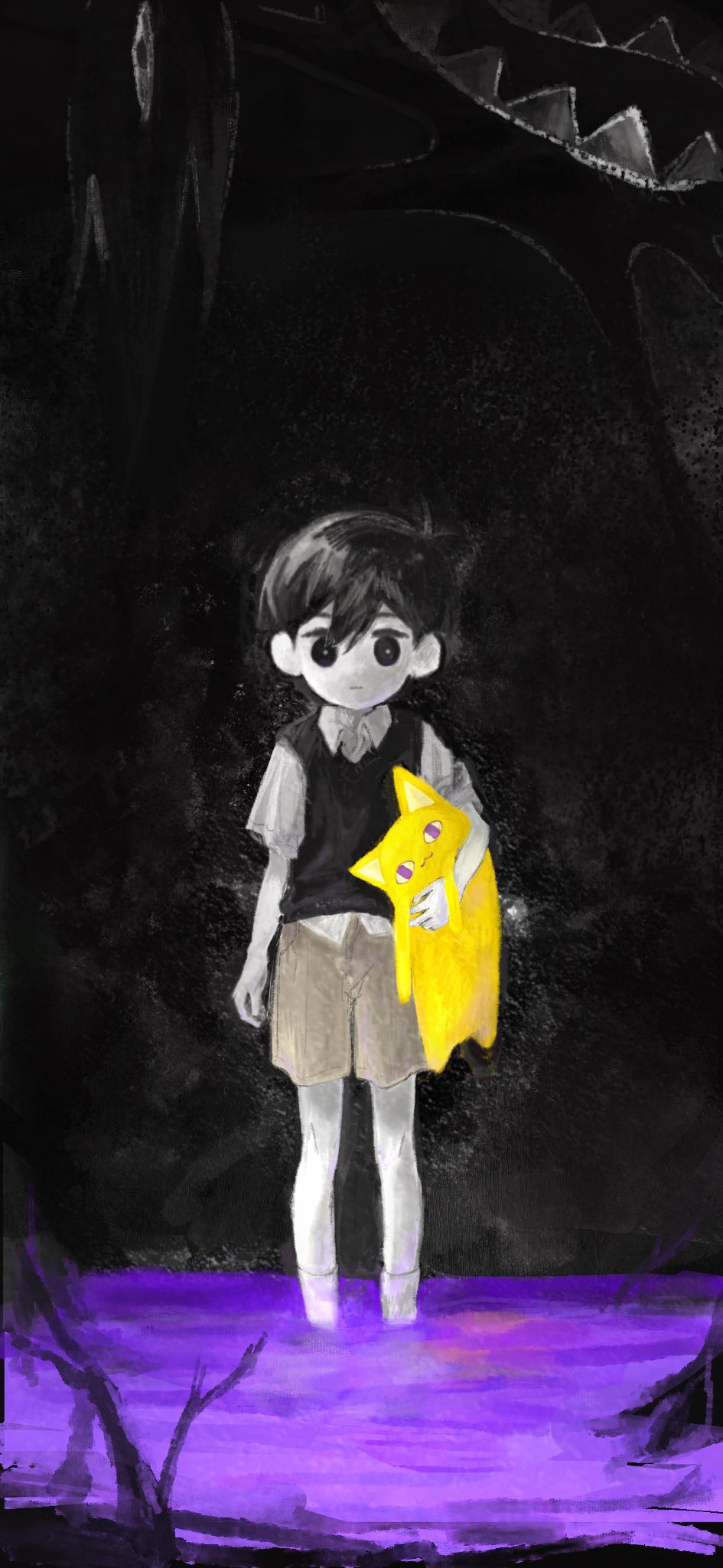 1boy 5_mugiko antenna_hair big_yellow_cat_(omori) black_eyes black_hair black_sweater_vest bright_pupils brown_shorts character_doll closed_mouth collared_shirt doll double-parted_bangs expressionless hair_between_eyes highres holding holding_stuffed_toy looking_at_viewer male_focus omori shirt short_hair short_sleeves shorts socks solo something_(omori) stuffed_toy sunny_(omori) sweater_vest white_pupils white_shirt white_socks