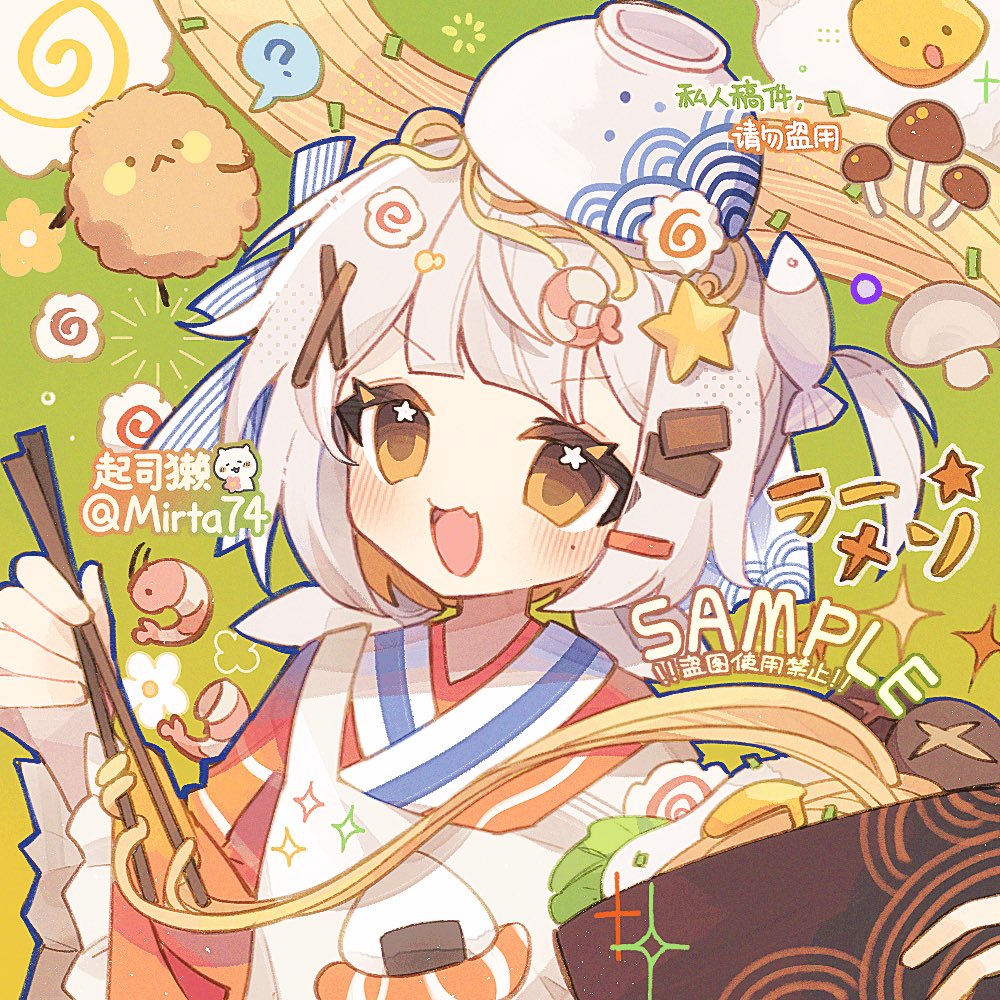 1girl :d apron artist_name blunt_bangs blush bowl bowl_hat brown_eyes chopsticks commentary commission fang food green_background grey_hair hat holding holding_chopsticks japanese_clothes kamaboko kimono long_sleeves looking_at_viewer mirta narutomaki noodles open_mouth original red_kimono short_hair shrimp skin_fang smile solo untranslatable_commentary upper_body watermark white_apron wide_sleeves