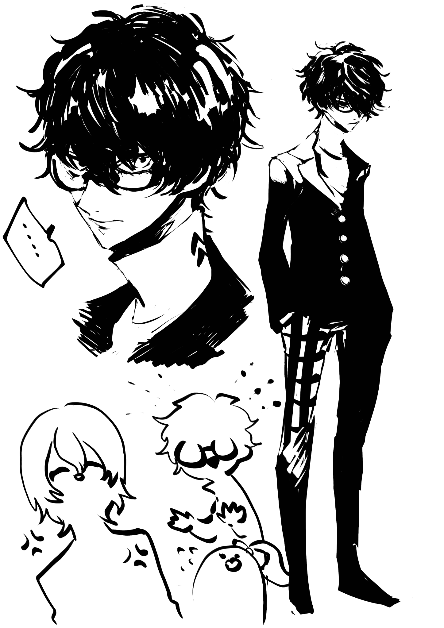 ... 1boy amamiya_ren anger_vein closed_mouth expressionless full_body glasses greyscale high_contrast highres male_focus monochrome pants persona persona_5 purano7 shirt short_hair simple_background sketch speech_bubble standing very_short_hair white_background