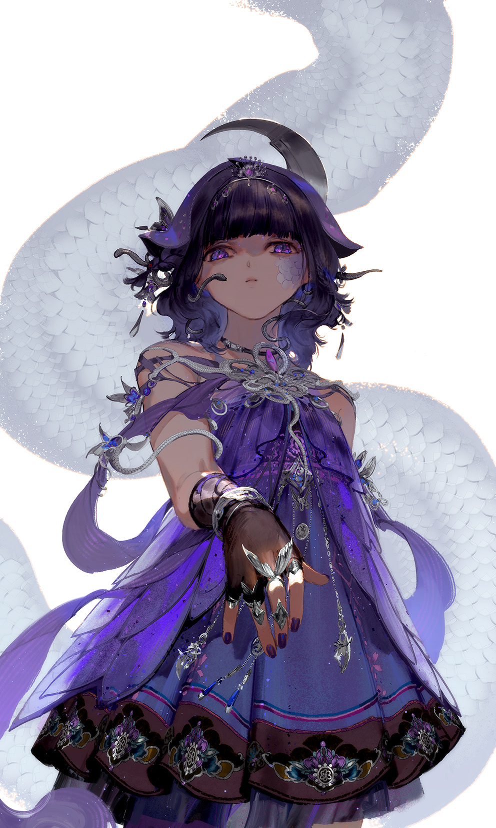 1girl arched_bangs black_gloves black_hair chinese_clothes closed_mouth commentary_request cowboy_shot dress du_luo_(jianxia_qingyuan) fingerless_gloves gloves hair_ornament highres ibuki_satsuki jewelry jianxia_qingyuan_(series) jianxia_qingyuan_online_3 looking_at_viewer miao_clothes multiple_rings purple_dress purple_eyes ring scales solo