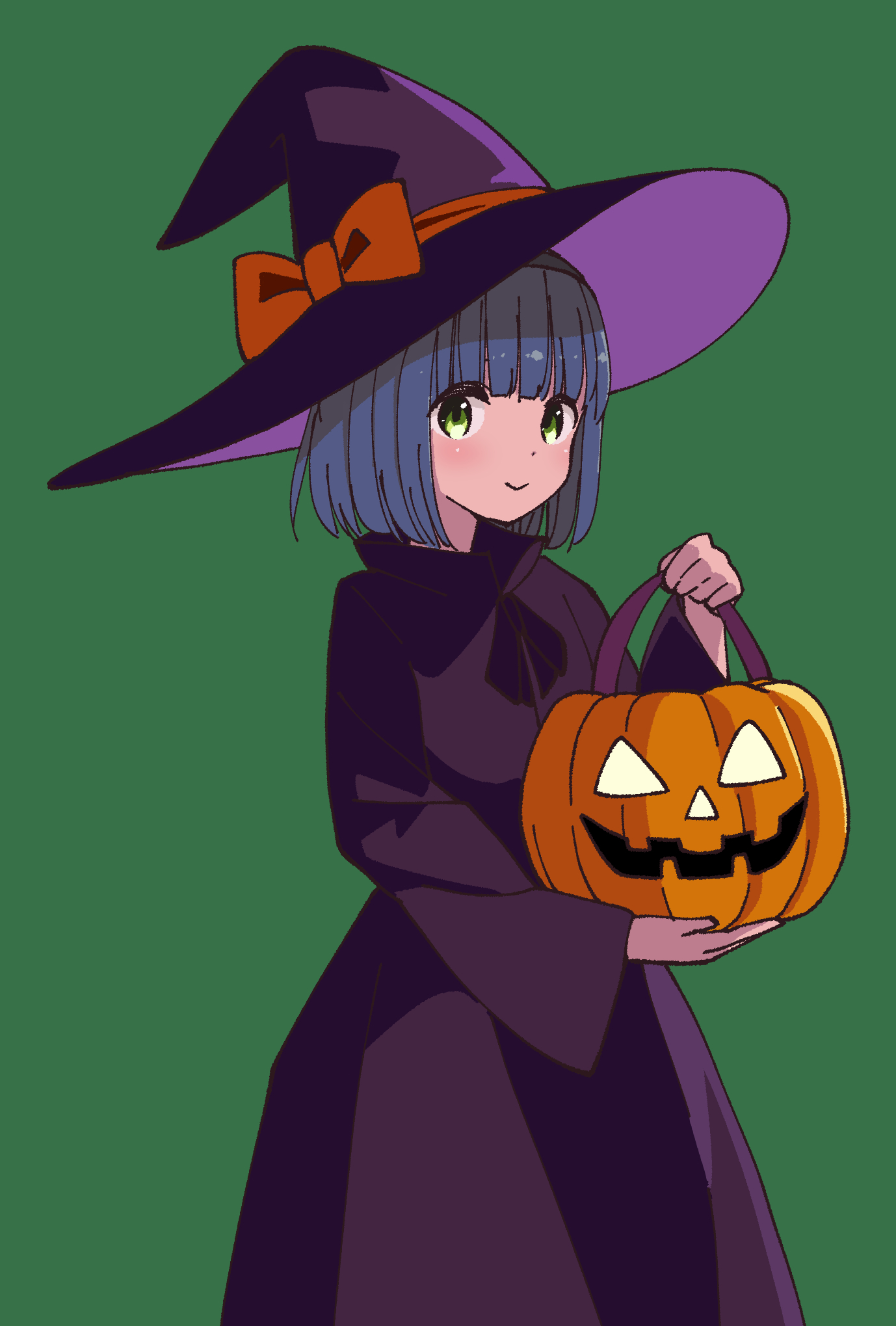 1girl black_dress black_hairband black_ribbon blue_hair blunt_bangs bow closed_mouth commentary_request dot_nose dress green_eyes hairband halloween halloween_bucket halloween_costume hat hat_bow highres hitoribocchi_no_marumaru_seikatsu holding katsuwo_(cr66g) kurai_kako long_dress long_sleeves looking_at_viewer neck_ribbon orange_bow purple_hat ribbon short_hair simple_background smile solo standing witch witch_hat