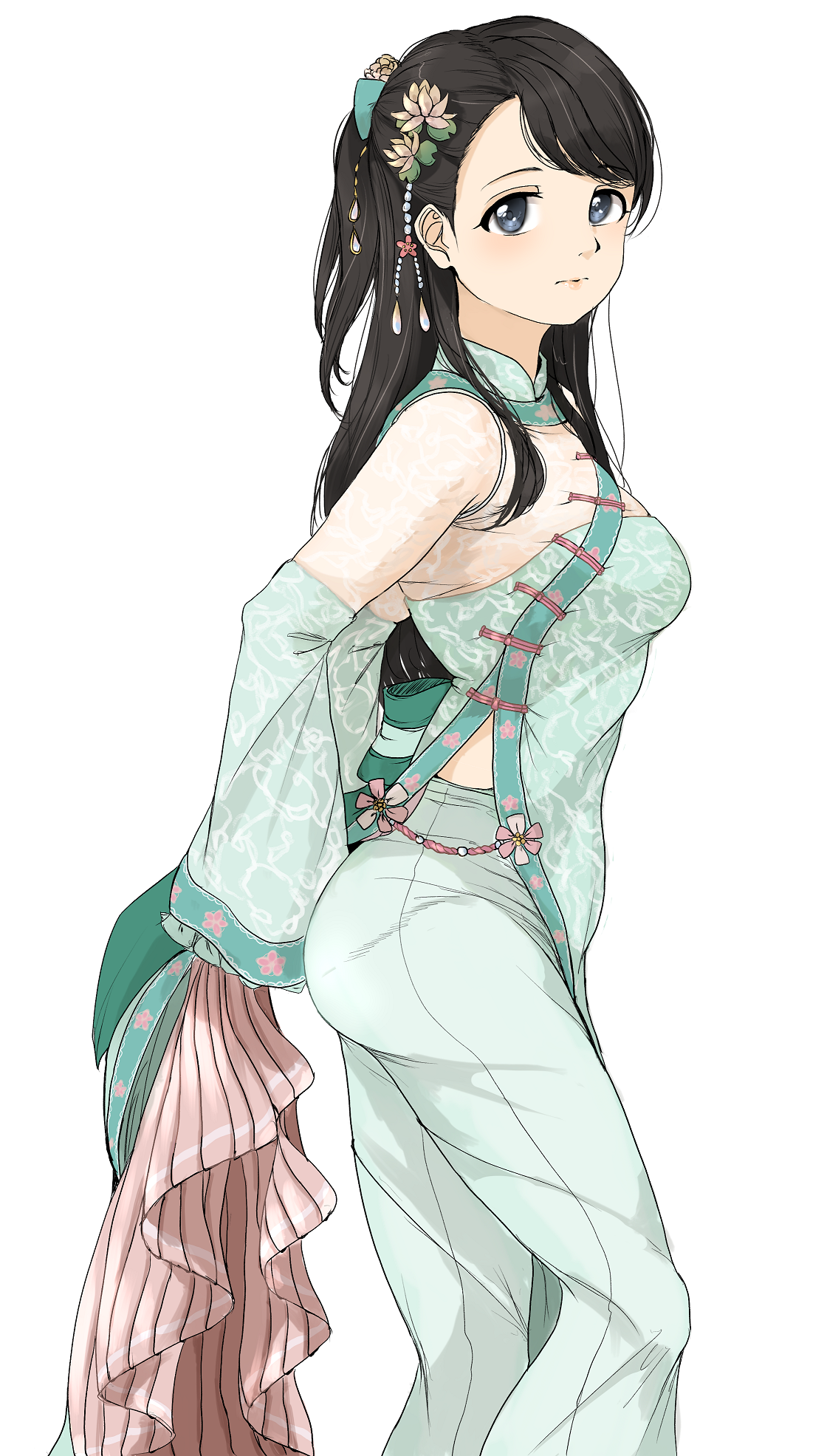 1girl ao_dai black_hair blue_eyes breasts dress flower gatsby_ssl hair_flower hair_ornament half_updo highres idolmaster idolmaster_cinderella_girls kurihara_nene long_hair medium_breasts midriff midriff_peek one_side_up sideboob