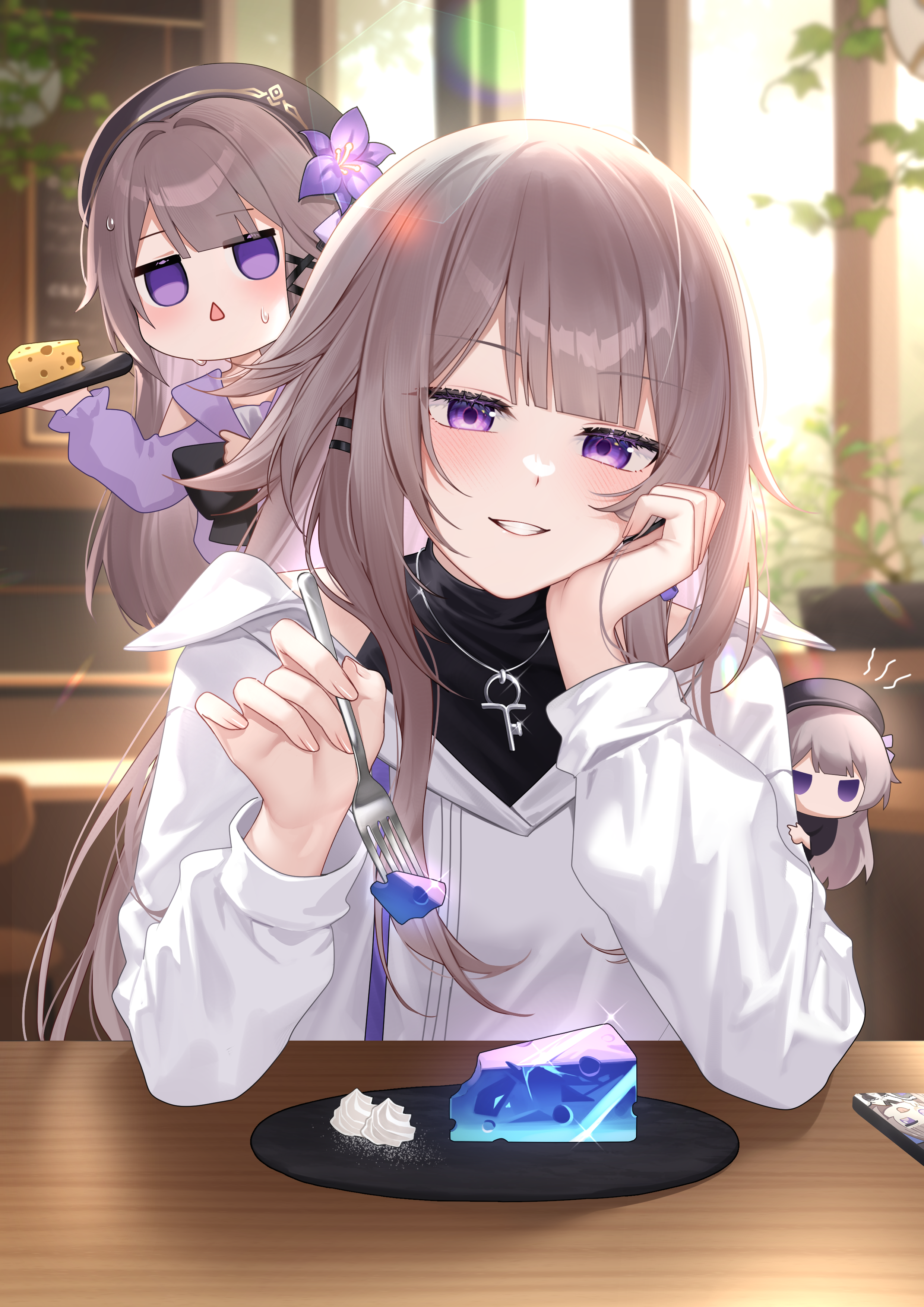 2girls absurdres blunt_bangs blurry blush brown_hair cafe cellphone cheese chibi commentary_request day depth_of_field dress elbow_rest flower food fork glint gold_trim hair_flower hair_ornament hand_on_own_cheek hand_on_own_face hat hat_flower head_tilt herta_(honkai:_star_rail) herta_(puppet)_(honkai:_star_rail) highres holding holding_fork holding_tray honkai:_star_rail honkai_(series) indoors jacket jewelry key key_necklace lens_flare long_hair long_sleeves looking_at_viewer menu_board multiple_girls necklace open_mouth parted_lips phone plant plate potted_plant purple_dress purple_eyes purple_flower shrimp_cake sidelocks silver_necklace smartphone smile sparkle sweat table teeth the_herta_(honkai:_star_rail) tray triangle_mouth very_long_hair whipped_cream white_jacket wooden_table x_hair_ornament