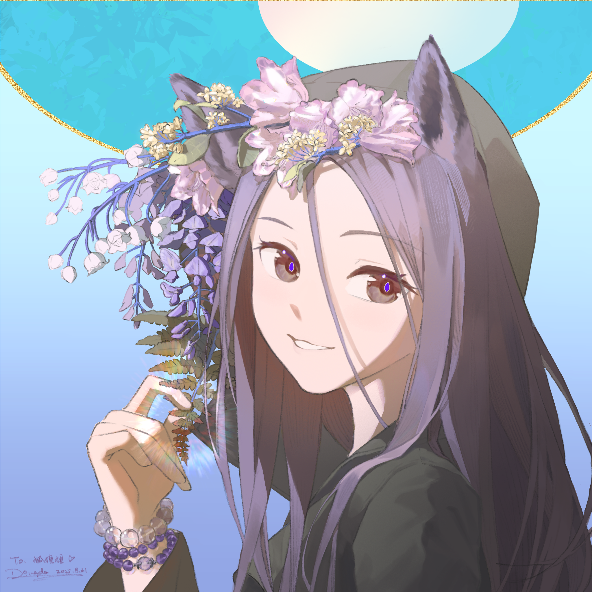 1girl animal_ears arm_up artist_name bead_bracelet beads black_eyes black_shirt bracelet chinese_commentary commentary_request dated dingda flower from_side hair_between_eyes highres holding holding_plant jewelry long_hair long_hair_between_eyes long_sleeves looking_at_viewer original parted_lips plant purple_flower purple_hair purple_pupils shirt smile solo wolf_ears