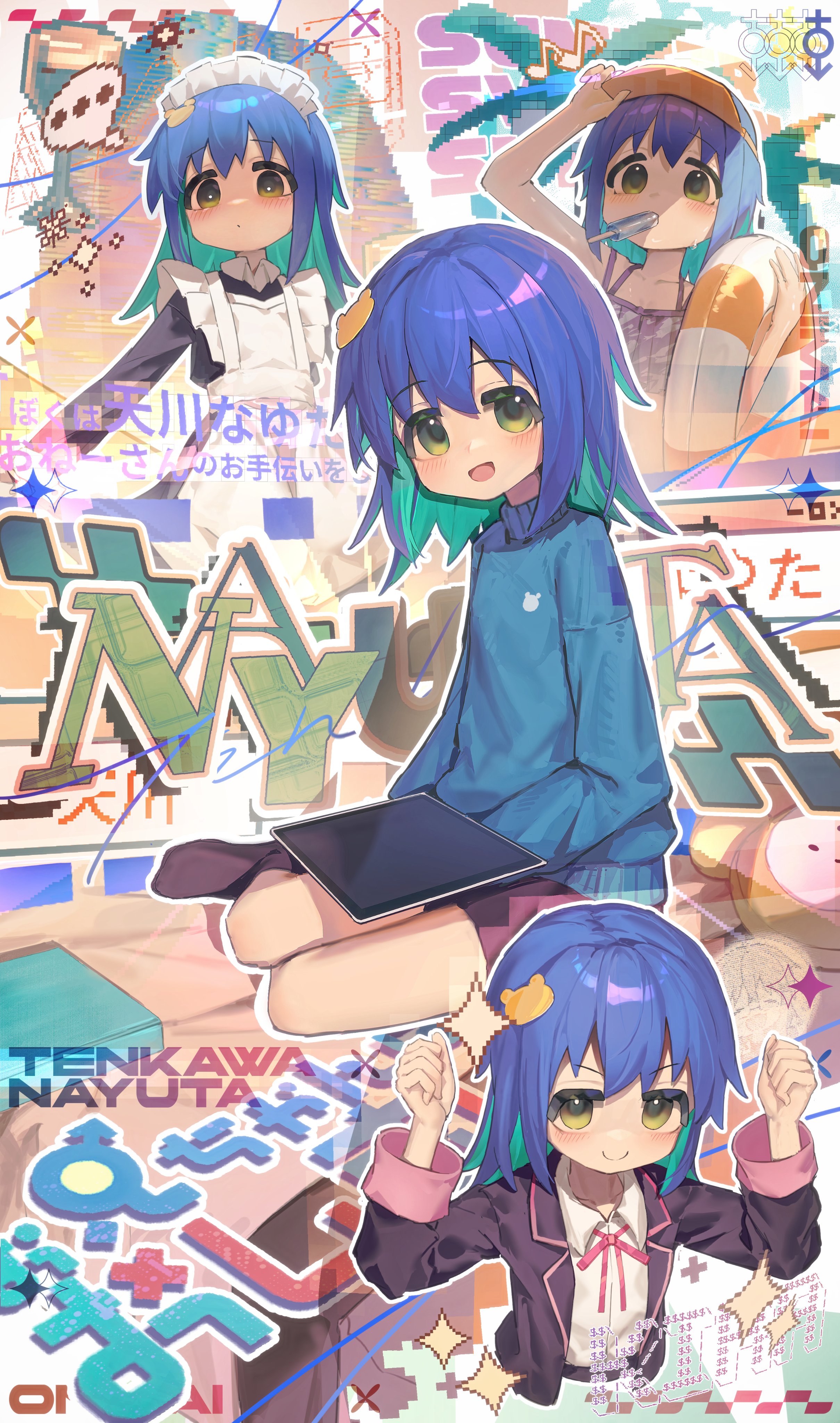 1girl absurdres ap04astral bear_hair_ornament blue_hair character_name flat_chest food food_in_mouth hair_ornament hat highres holding holding_swim_ring innertube jacket light_smile long_hair long_sleeves looking_at_viewer maid maid_headdress male-female_symbol multiple_views neck_ribbon onii-chan_wa_oshimai! open_mouth popsicle popsicle_in_mouth ribbon school_uniform sitting smile socks swim_ring swimsuit tablet_pc tenkawa_nayuta yellow_eyes yokozuwari