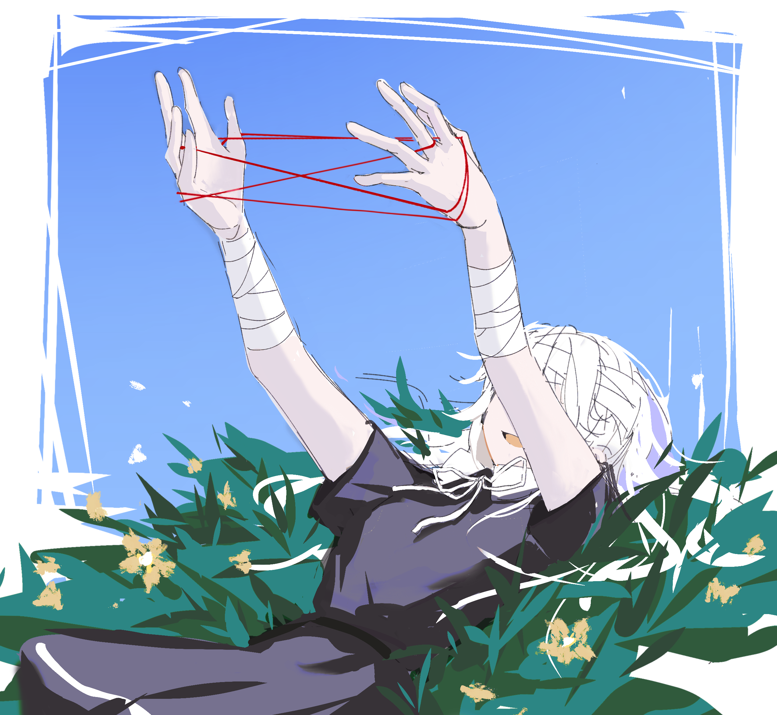 1girl arms_up bandaged_arm bandaged_head bandages black_dress blue_sky cat's_cradle covered_eyes day dress flower grass highres kashimiya_karua long_hair lying murnal. neck_ribbon on_back on_ground open_mouth outdoors ribbon short_sleeves sky smile solo the_hundred_line_-last_defense_academy- white_hair white_ribbon yellow_flower