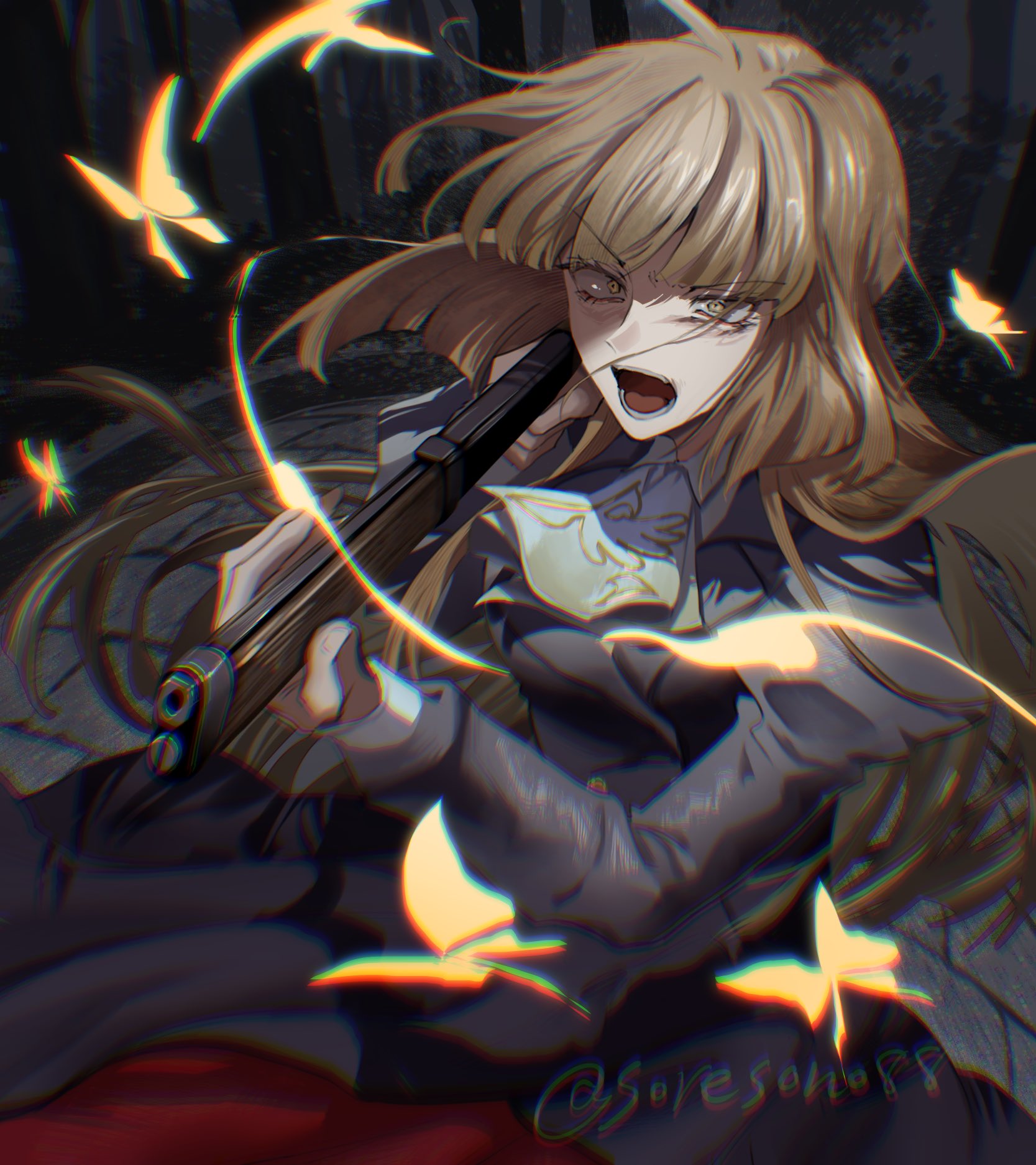 1girl angry artist_name black_dress brown_hair bug butterfly commentary_request constricted_pupils dress eyelashes floating_hair gun highres holding holding_gun holding_weapon insect long_hair looking_at_viewer open_mouth rifle solo soresono88 twitter_username umineko_no_naku_koro_ni ushiromiya_rosa v-shaped_eyebrows weapon yellow_butterfly yellow_eyes