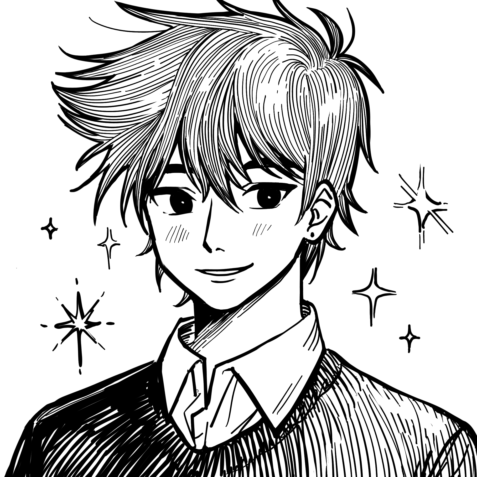 1boy :d antenna_hair bu3hgg collared_shirt double-parted_bangs earrings greyscale grin hair_behind_ear hair_between_eyes hatching_(texture) hero_(faraway)_(omori) hero_(omori) high_contrast highres jewelry looking_at_viewer male_focus monochrome omori open_mouth portrait shirt short_hair simple_background smile solo sparkle stud_earrings sweater thick_eyebrows very_short_hair white_background