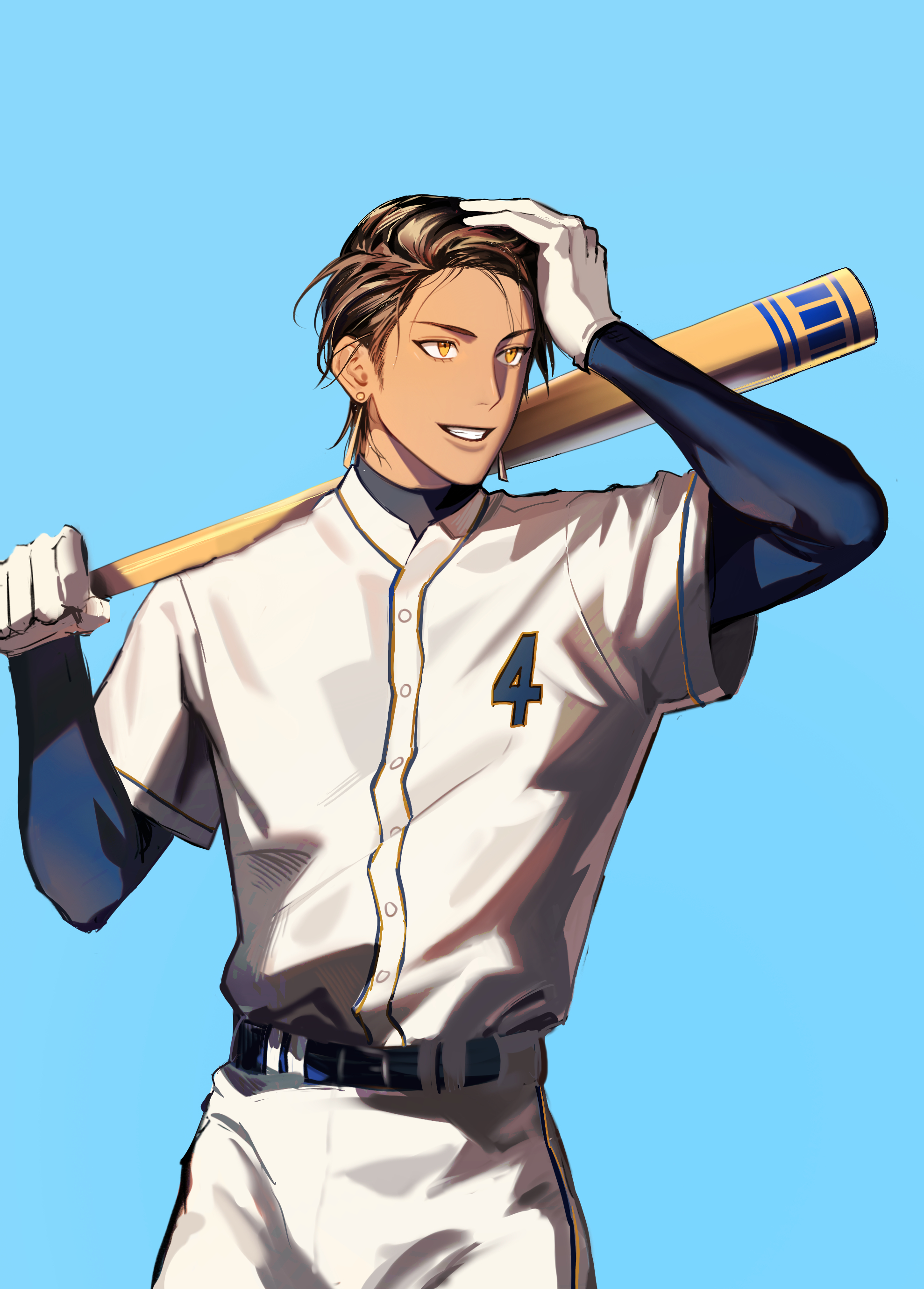 1boy absurdres baseball_bat belt blue_background brown_hair buttons commentary_request earrings fate/grand_order fate_(series) gloves grin hand_on_own_head highres holding holding_baseball_bat jewelry kotomine_(a1569) male_focus orange_eyes ozymandias_(fate) pants shirt short_hair short_sleeves sideburns simple_background smile solo white_gloves white_pants white_shirt