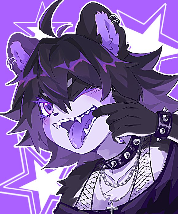 1girl ahoge androgynous animal_ears animal_hands bear_ears bear_girl black_fur black_hair chain chain_necklace claws collar colored_eyelashes colored_tongue commentary commission cross cross_necklace fishnet_top fishnets furry furry_female jewelry limited_palette looking_at_viewer medium_hair mouth_pull necklace neku_boo one_eye_closed original panda_ears panda_girl punk purple_background purple_eyes purple_theme purple_tongue sharp_teeth solo spiked_collar spikes teeth tongue tongue_out upper_body