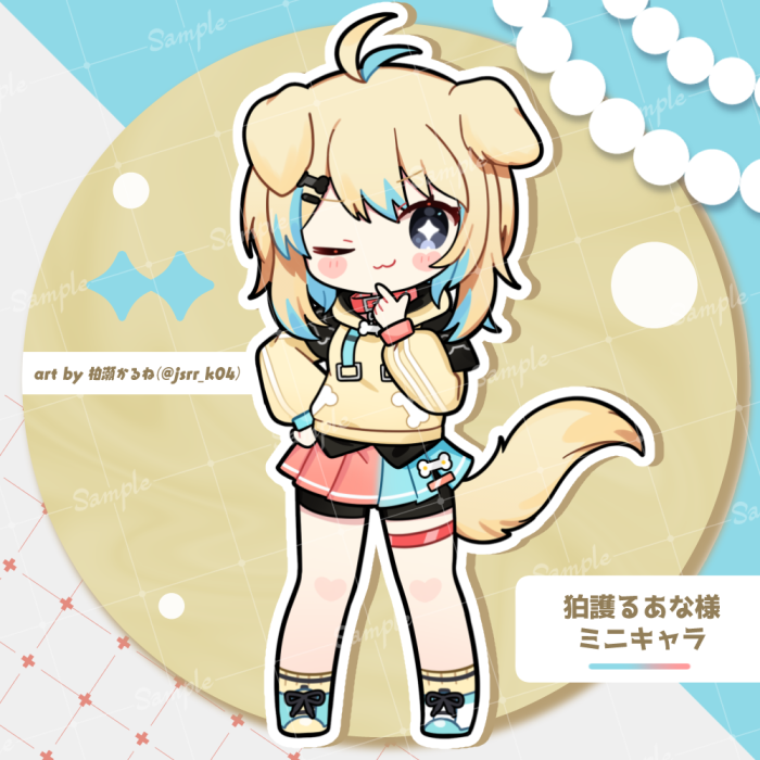 +_+ 1girl ;3 animal_ears antenna_hair artist_name bike_shorts bike_shorts_under_skirt blonde_hair blue_hair blue_shoes blue_skirt blush_stickers closed_mouth collar commentary_request dog_ears dog_girl drawstring drop_shadow full_body grey_eyes hand_on_own_hip hand_up hood hood_down hoodie indie_virtual_youtuber kashiwase_karune komago_ruana long_sleeves looking_at_viewer miniskirt multicolored_hair one_eye_closed outline pleated_skirt red_collar red_skirt ribbed_socks sample_watermark shoes short_hair skirt smile socks solo standing streaked_hair twitter_username two-tone_skirt virtual_youtuber watermark watermark_grid white_outline yellow_hoodie yellow_socks