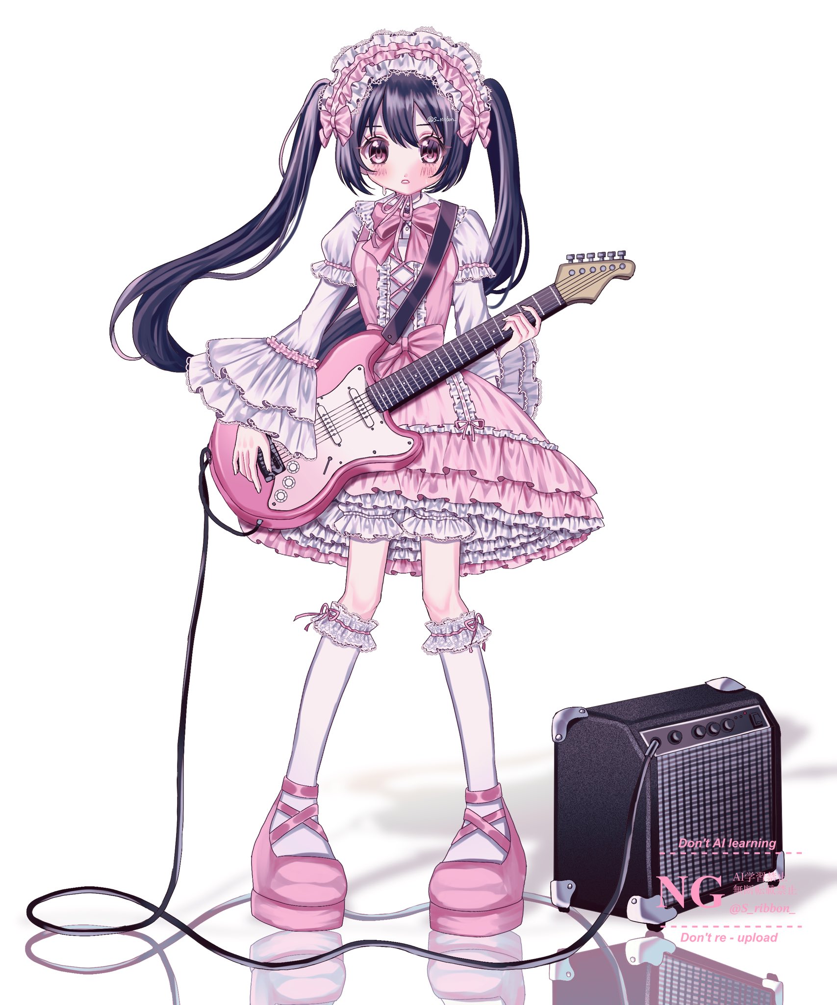 1girl accurate_lolita_coord amplifier black_hair bloomers blush bow breasts cable dress electric_guitar frilled_dress frilled_sleeves frills full_body guitar hairband highres holding holding_guitar holding_instrument instrument lolita_fashion lolita_hairband long_hair long_sleeves looking_at_viewer mary_janes original petticoat pink_bow pink_dress pink_shoes reflection shoes simple_background small_breasts socks solo standing sweet_lolita twintails underwear very_long_hair watermark white_background white_socks yuni_(s_ribbon)