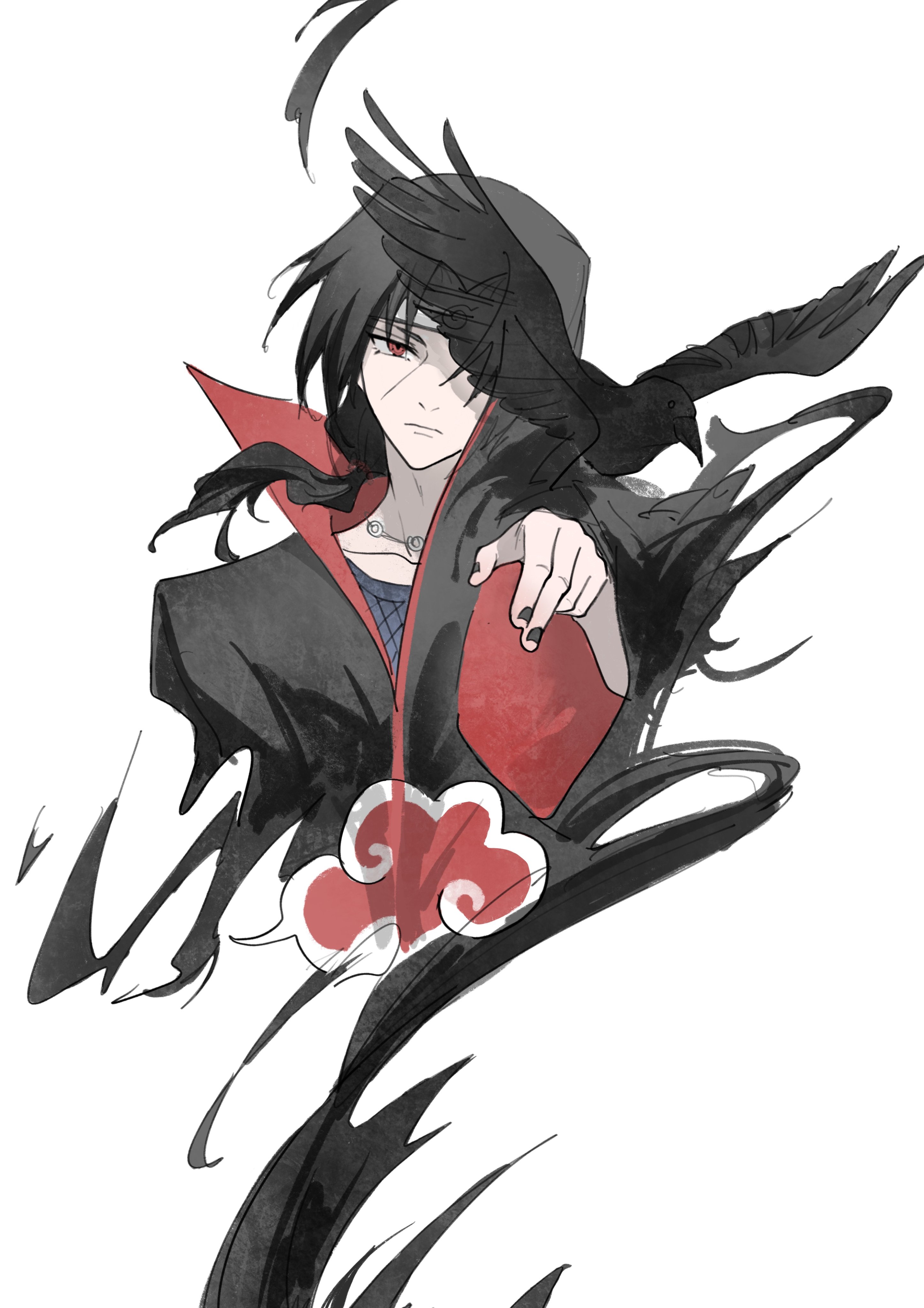 1boy absurdres akatsuki_uniform bird black_hair black_nails closed_mouth crow facial_mark fishnet_top fishnets headband highres jewelry long_hair low_ponytail male_focus nail_polish naruto_(series) necklace omegaantiworld one_eye_covered parted_bangs ponytail red_eyes solo uchiha_itachi upper_body white_background