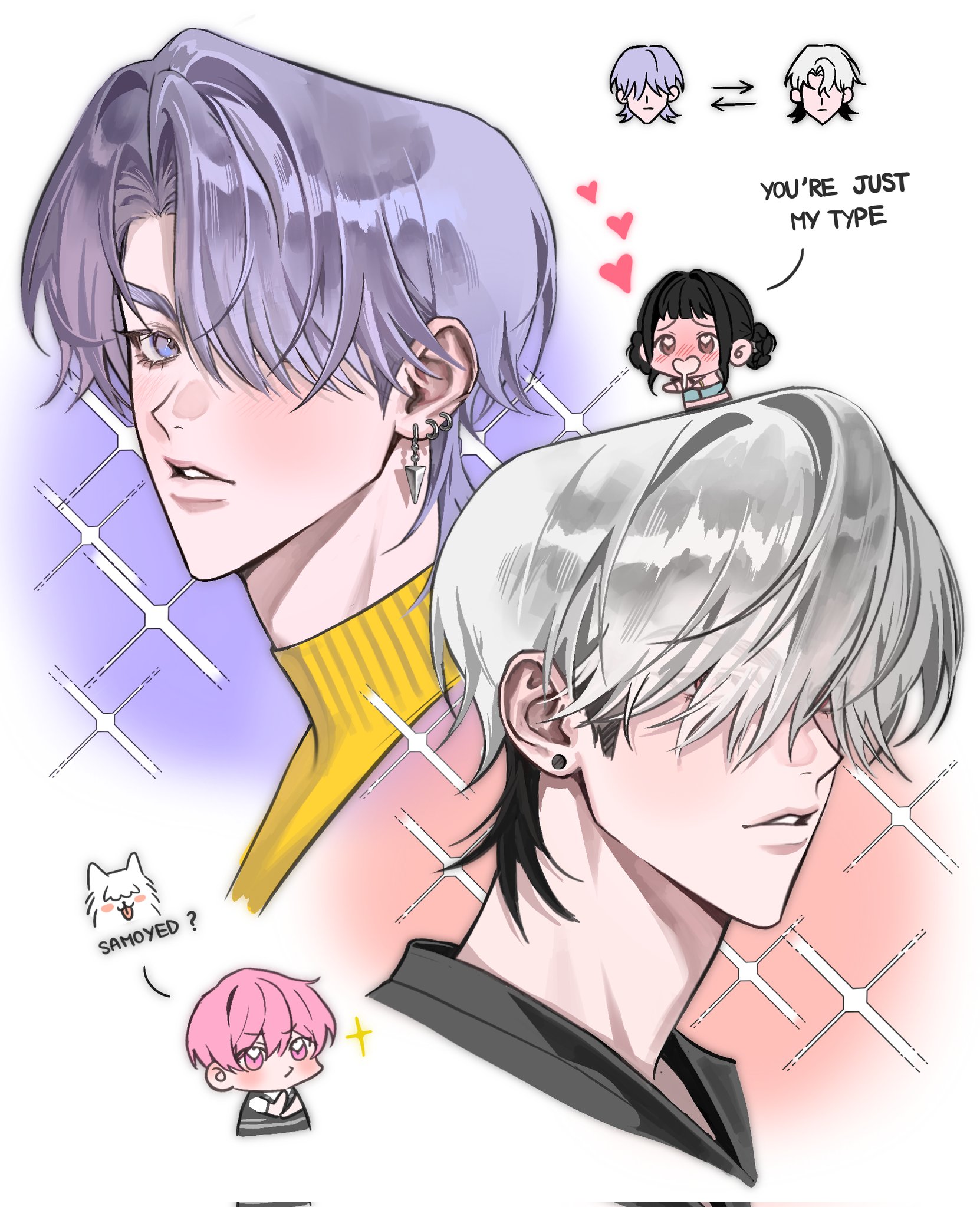 1girl 3boys amo_0202 arrow_(symbol) bamby_(plave) black_hair chibi chibi_inset cropped_head double_bun earrings english_text eunho_(plave) grey_hair hair_between_eyes hair_bun hair_over_eyes hair_over_one_eye heart heart_in_eye highres jewelry kpop_demon_hunters looking_at_viewer multiple_boys mystery_(kpop_demon_hunters) parted_lips pink_hair plave purple_hair simple_background symbol_in_eye turtleneck white_background zoey_(kpop_demon_hunters)
