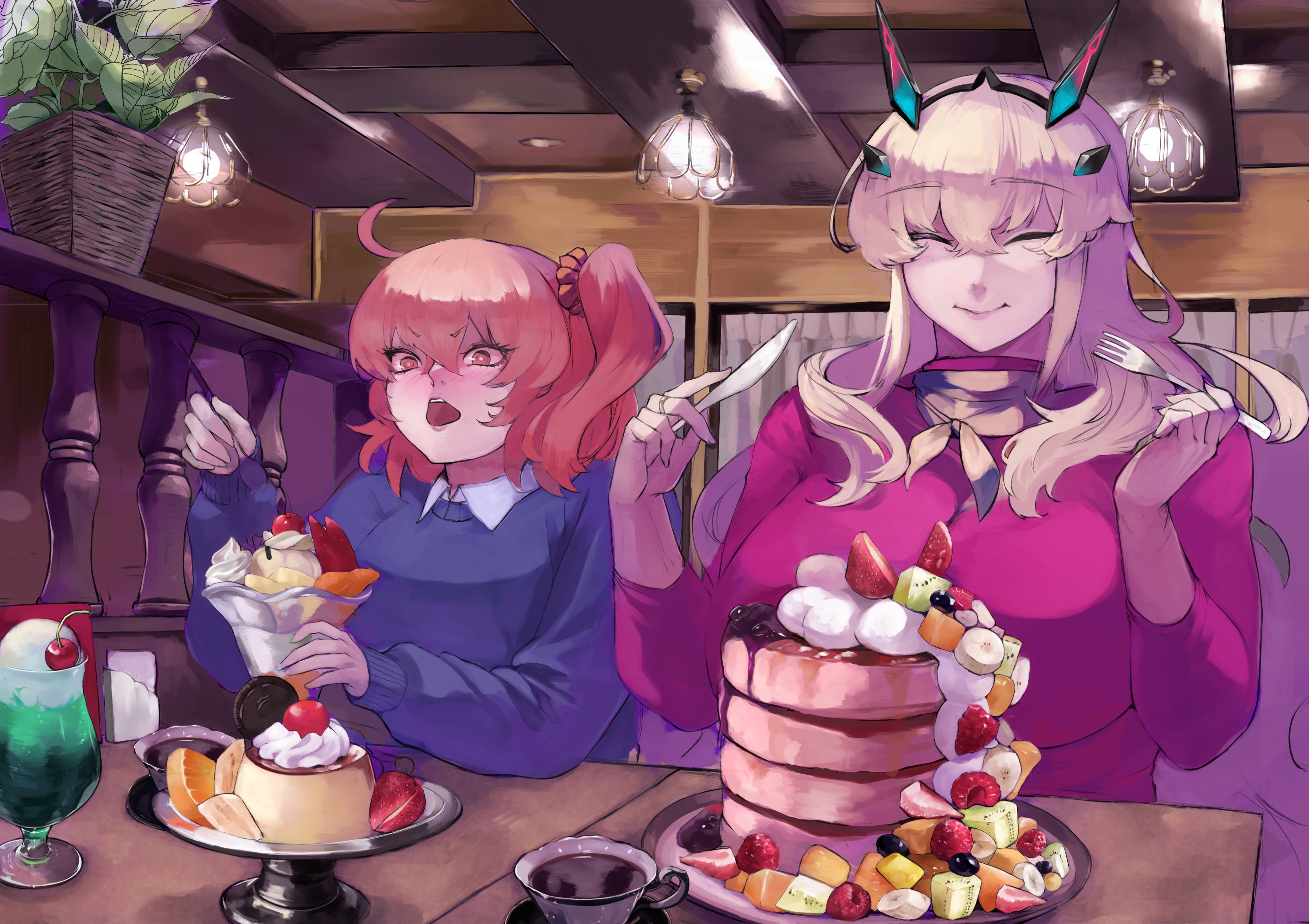 2girls absurdres ahoge barghest_(fate) blonde_hair breasts brown_eyes closed_eyes desert fate/grand_order fate_(series) food fork fruit fujimaru_ritsuka_(female) gumi_(the_eye_of_darkness) hair_between_eyes highres holding holding_fork holding_knife horns huge_breasts knife lips long_hair multiple_girls open_mouth orange_hair pancake pancake_stack parfait plant potted_plant side_ponytail smile sweater very_long_hair whipped_cream