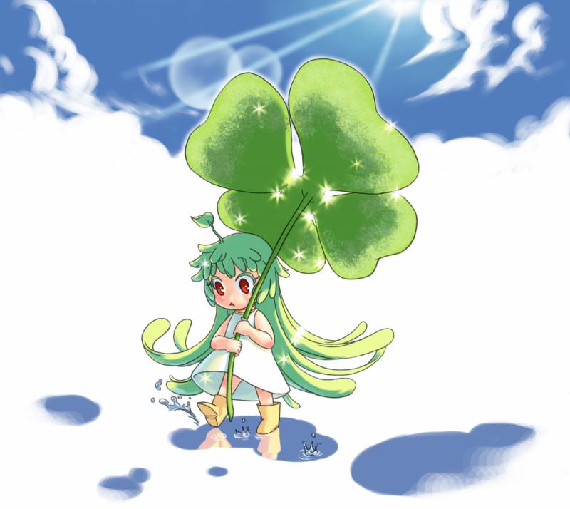 1girl 6bi blue_sky boots chinese_commentary cloud clover commentary_request day dress four-leaf_clover full_body green_hair lif_(ragnarok_online) long_hair looking_down outdoors plant_hair puddle ragnarok_online red_eyes sky sleeveless sleeveless_dress solo sun triangle_mouth very_long_hair water white_dress yellow_boots