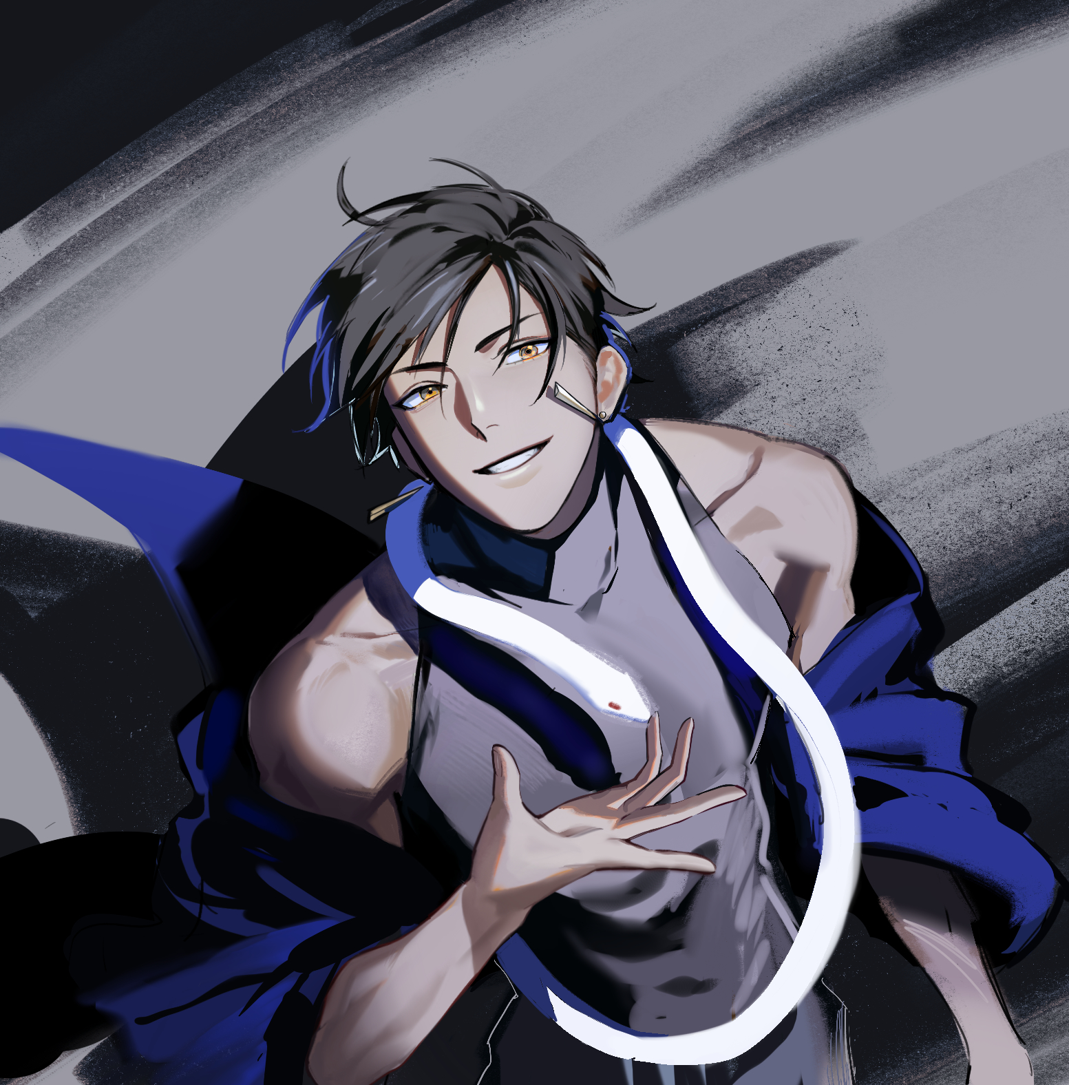 1boy black_hair collarbone commentary_request earrings fate/grand_order fate_(series) from_above grey_shirt highres jewelry kotomine_(a1569) looking_at_viewer male_focus orange_eyes ozymandias_(fate) parted_lips shirt short_hair sleeveless sleeveless_shirt snake snake_wrapped_around_neck solo upper_body white_snake