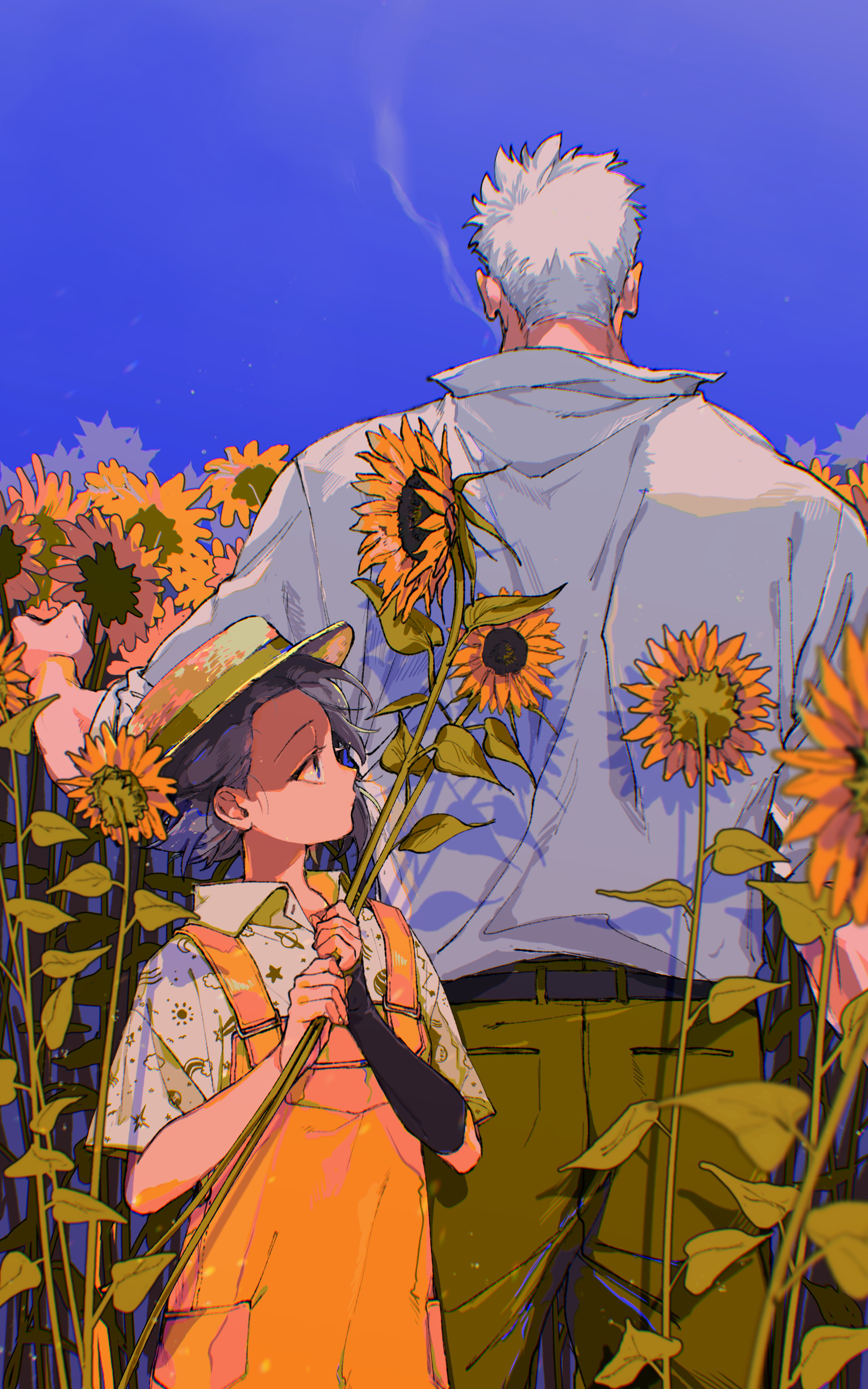 1boy 1girl absurdres arm_warmers back belt black_belt blue_sky clear_sky closed_mouth collared_shirt commentary_request cowboy_shot day field flower flower_field green_pants green_ribbon grey_hair hat hat_ribbon height_difference highres holding holding_flower kabane_(rjev8385) light_particles oc_x_canon one_piece original outdoors overalls pants print_shirt profile ribbon shirt short_hair short_sleeves single_arm_warmer sky smoke smoke_trail smoker_(one_piece) smoking standing star_(symbol) sun_hat sunflower sunflower_field white_hair white_shirt yellow_flower yellow_overalls