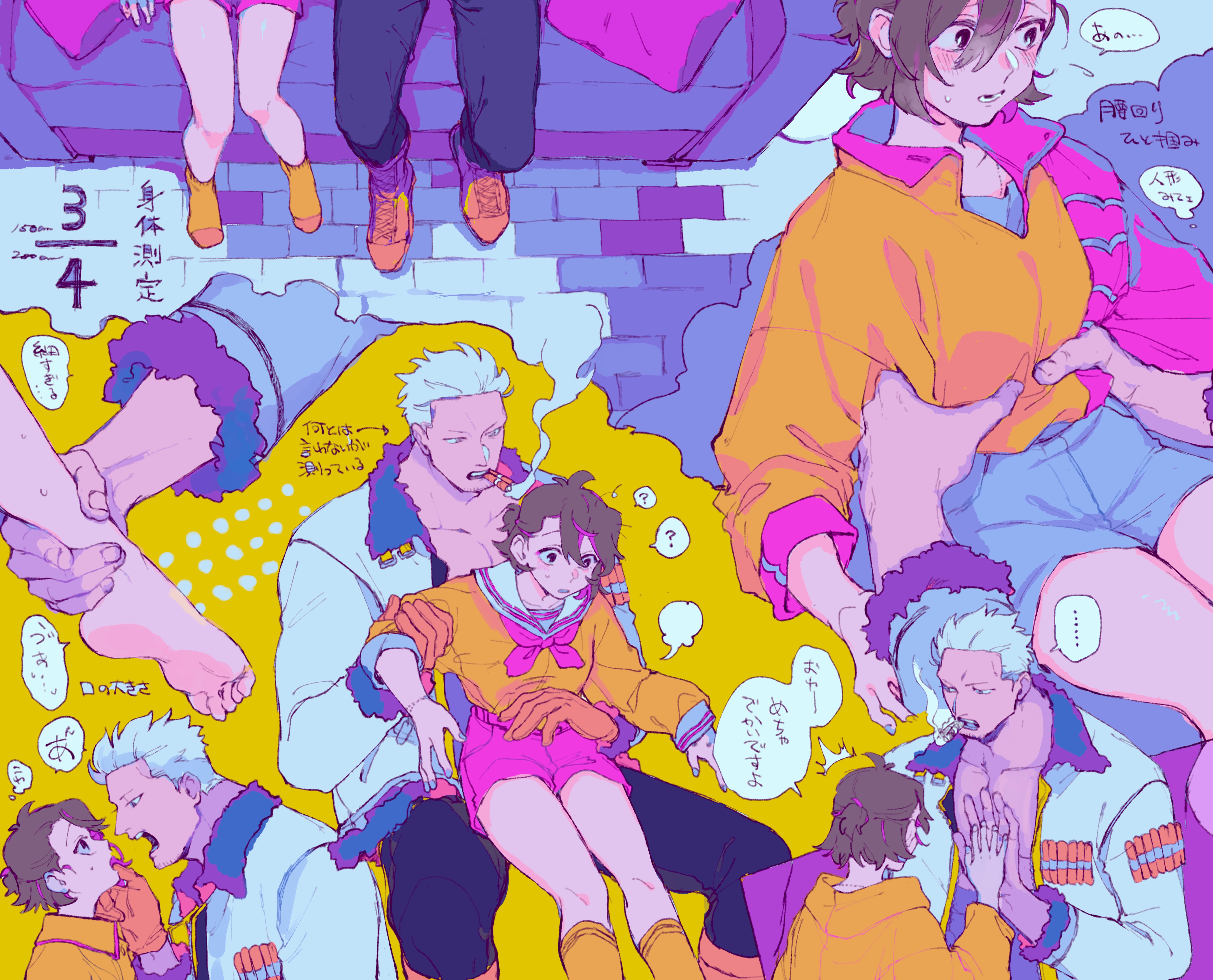 1boy 1girl ^^^ absurdres black_pants blue_shorts blush boots brick_floor brown_boots brown_gloves chain_smoking collarbone commentary_request couch couple cushion eye_contact finger_in_another's_mouth fur-trimmed_sleeves fur_trim gloves grey_eyes grey_hair hands_on_another's_waist height hetero highres holding_another's_ankle holding_another's_arm holding_hands jacket kabane_(rjev8385) long_sleeves looking_at_another multiple_views muscular muscular_male nervous no_shirt oc_x_canon on_couch one_piece original palms_together pants pink_shorts ponytail profile sailor_collar shirt short_hair short_ponytail shorts sitting smoke smoke_trail smoker_(one_piece) smoking socks speech_bubble translation_request white_sailor_collar white_shirt yellow_jacket yellow_shirt yellow_socks