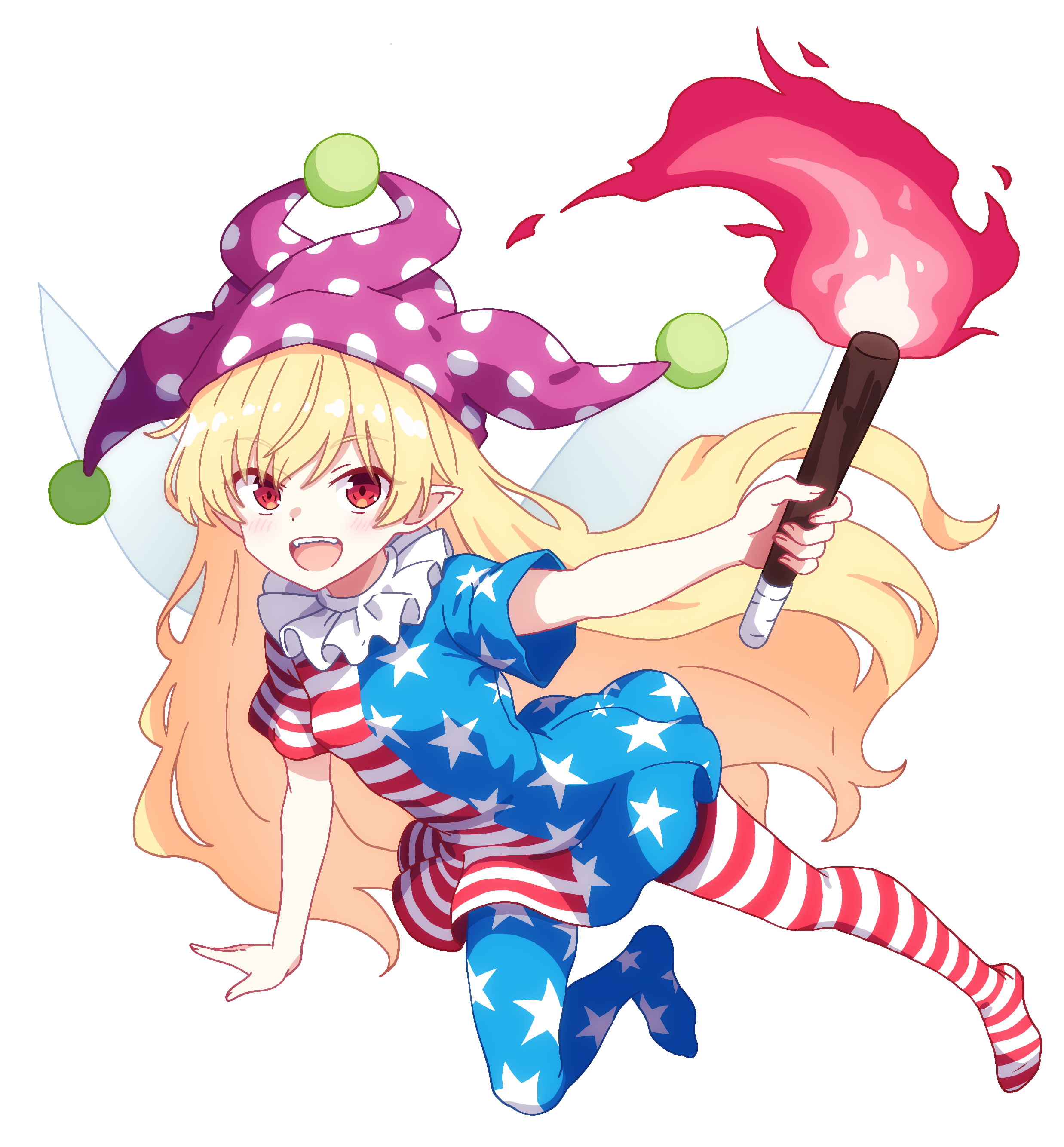 1girl absurdres american_flag american_flag_dress american_flag_legwear american_flag_print blue_dress blue_pantyhose blush clownpiece commentary dress fairy_wings flag_print hat highres holding holding_torch jester_cap long_hair looking_at_viewer multicolored_dress neck_ruff open_mouth pantyhose pioartstuff pointy_ears polka_dot polka_dot_headwear purple_hat red_dress red_eyes red_pantyhose short_sleeves smile solo star_(symbol) star_print striped_clothes striped_dress striped_pantyhose teeth torch touhou transparent_background upper_teeth_only very_long_hair wings