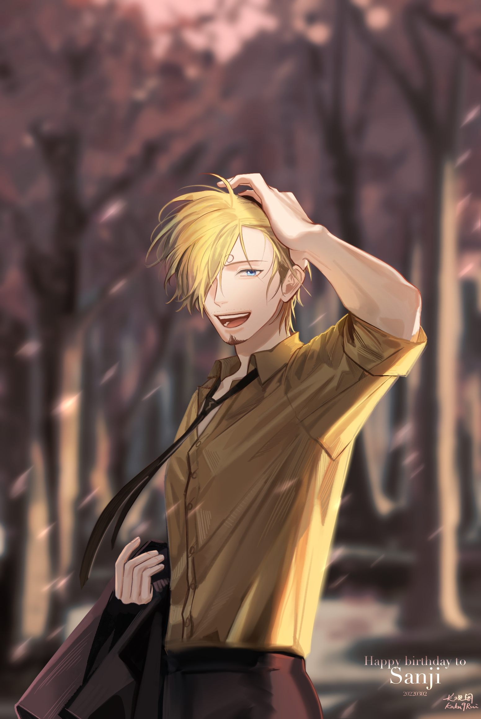 1boy black_necktie black_pants blonde_hair blue_eyes buttons commentary_request curly_eyebrows facial_hair goatee hair_over_one_eye hand_on_own_head happy_birthday highres holding holding_jacket holding_unworn_clothes jacket kotomine_(a1569) male_focus necktie one_piece open_mouth pants sanji_(one_piece) shirt solo spring_(season) unworn_jacket yellow_shirt