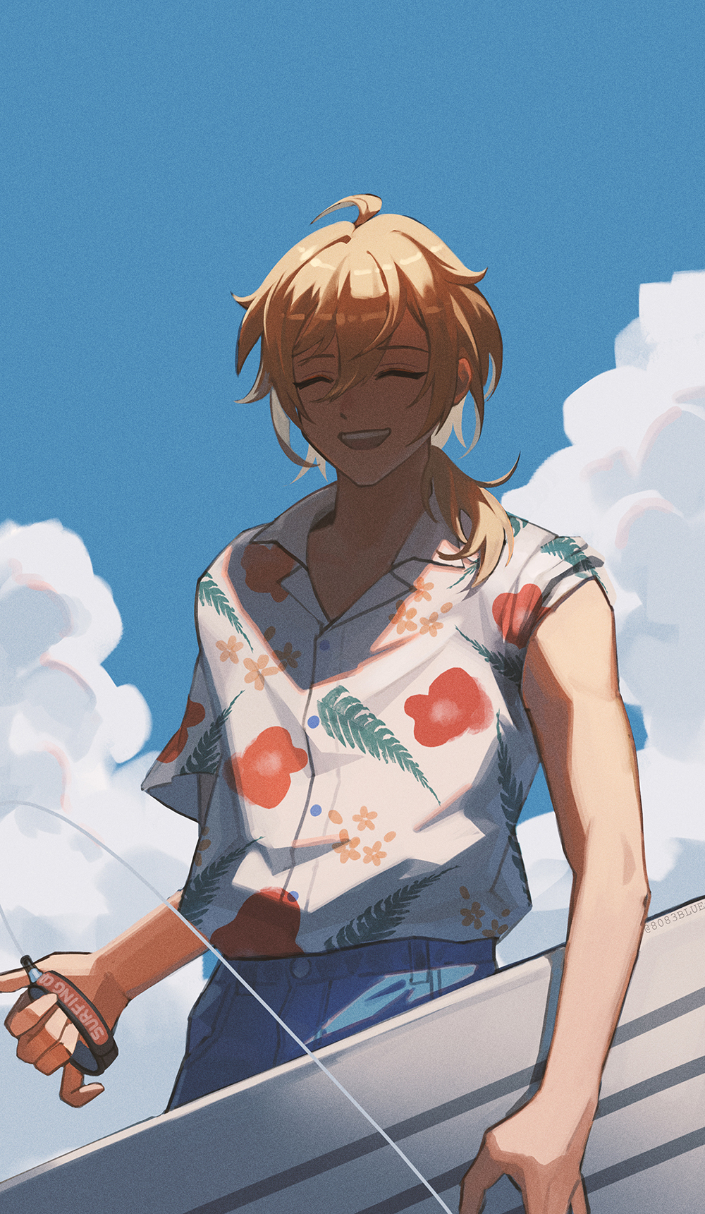 1boy 8083_blue blue_sky brown_hair cloud collared_shirt commentary_request ensemble_stars! hakaze_kaoru happy hawaiian_shirt highres holding male_focus outdoors pants shirt short_sleeves sky solo summer