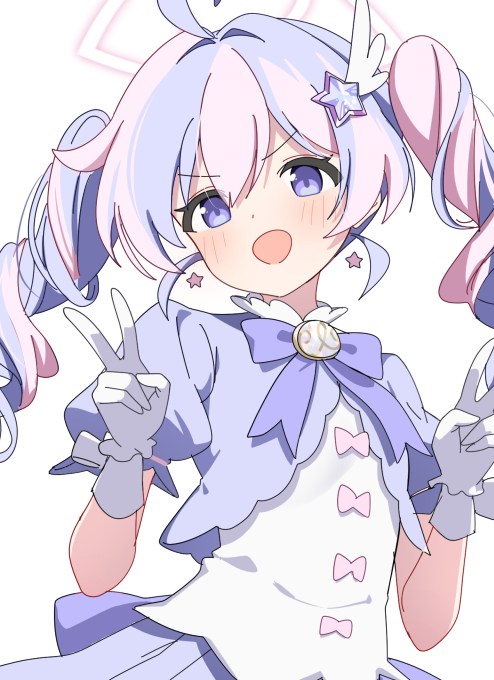 1girl ahoge blue_archive blue_hair blush bow bowtie double_v earrings foulo_paints gloves hair_between_eyes hair_ornament halo jewelry long_hair looking_at_viewer multicolored_hair official_alternate_costume open_mouth pink_hair pink_halo puffy_short_sleeves puffy_sleeves purple_bow purple_bowtie purple_eyes purple_hair purple_skirt reisa_(blue_archive) reisa_(magical)_(blue_archive) short_sleeves simple_background skirt smile solo star_(symbol) star_earrings star_hair_ornament streaked_hair twintails two-tone_hair upper_body v white_background white_gloves
