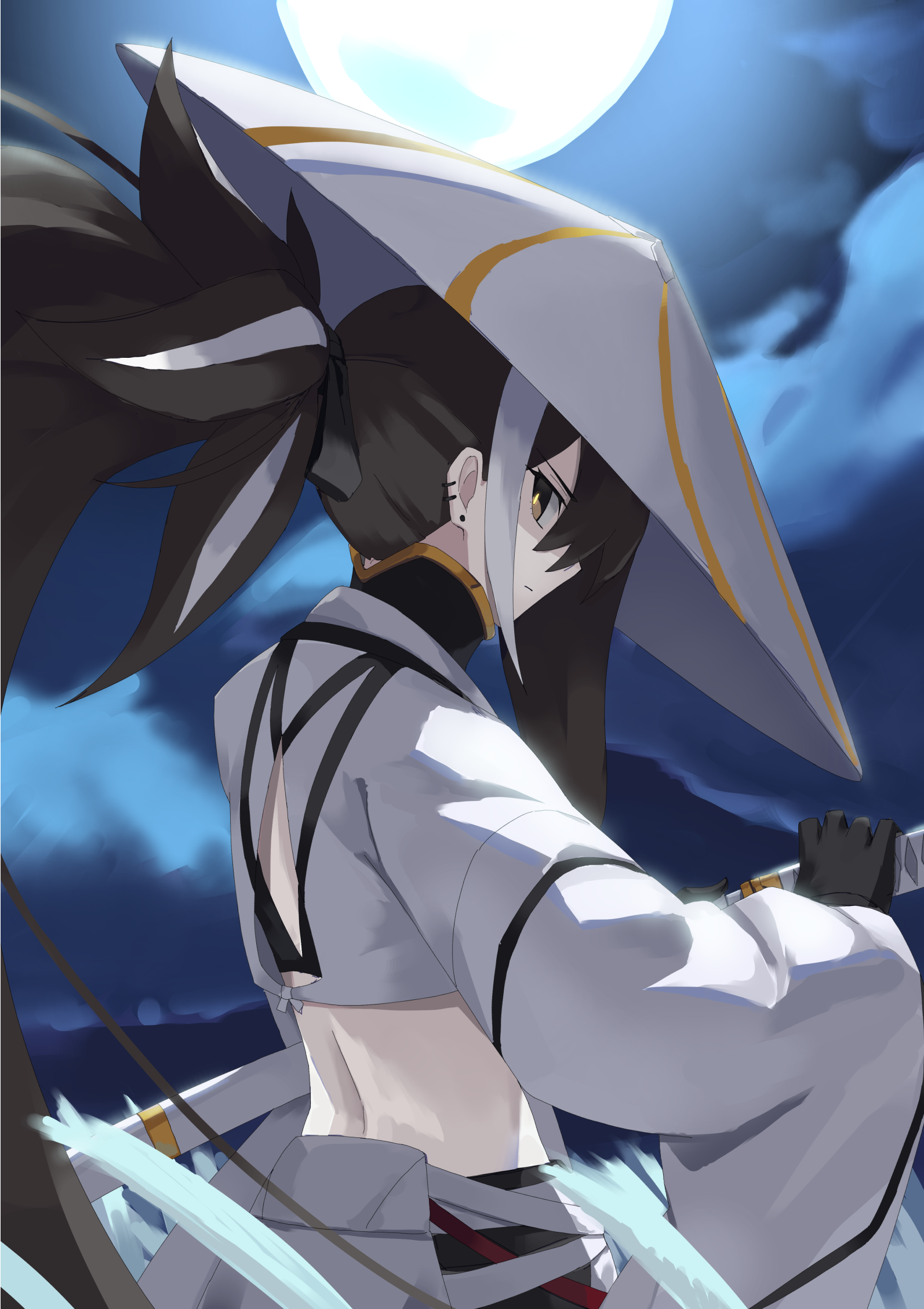1girl black_eyes black_hair fate/grand_order fate_(series) hat highres holding holding_sword holding_weapon japanese_clothes kawakami_gensai_(fate) kawakami_gensai_(third_ascension)_(fate) long_hair looking_back moon ponytail scabbard sheath solo sword tsukinaga weapon white_hair white_hat